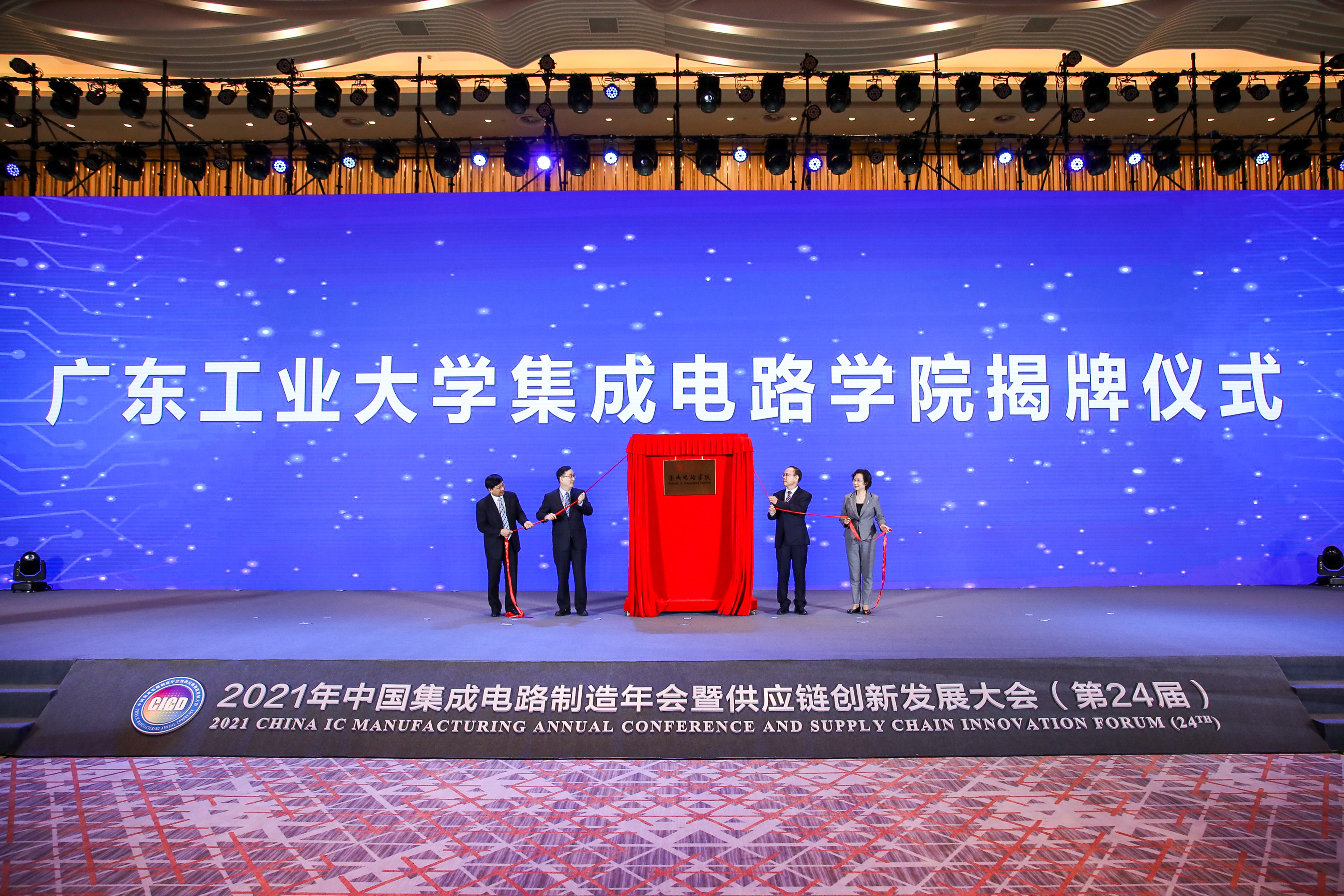 11月2日上午,在广州市黄埔区举办的第24届中国集成电路制造年会暨供应链创新发展大会高峰论坛上,8xbet网集成电路学院揭牌成立。广东省副省长王曦、广东省教育厅副厅长那佳、8xbet网校长邱学青共同为集成电路学院揭牌。来自集成电路产业界、科技界、教育界、金融界等各界人士共500余名嘉宾参加活动。