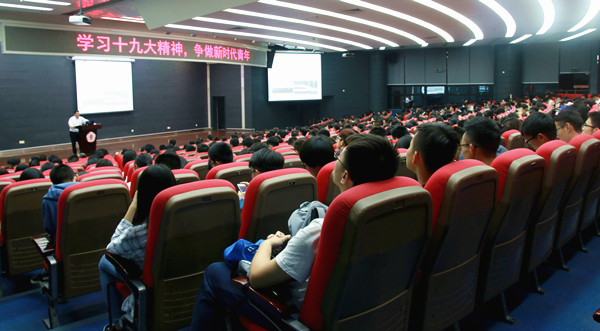 本网讯 4月19日晚,我校大学城校区大讲堂三楼报告厅座无虚席,来自各学院500多名学生正在聆听思政第一课。校党委书记、校长陈新为同学们作了《学习党的十九大精神,争做新时代青年》的讲座,一起学习了党的十九大报告,回顾了当代中国取得的辉煌成就,寄语大学生要认清责任和使命,践行社会主义核心价值观,争做能担当民族复兴大任的新时代青年。