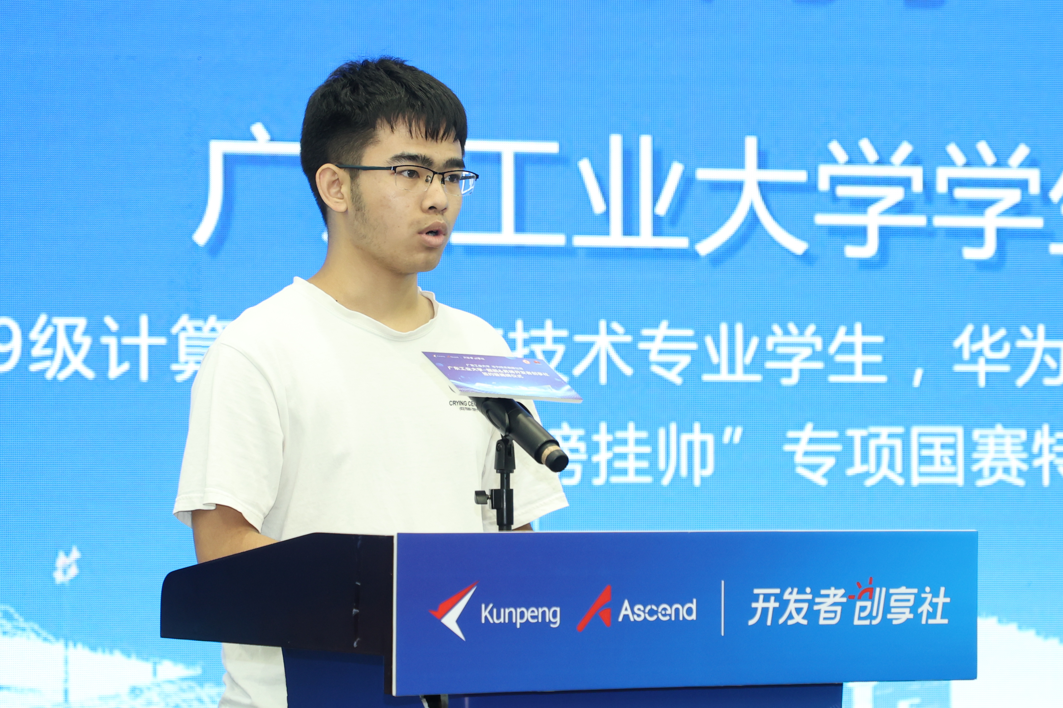 揭牌仪式上,华为智能基座“未来之星”、广工2019级计算机学院学生蒙永翔分享了他获第十七届挑战杯“揭榜挂帅”专项国赛特等奖的经历。他说:“实验过程中,能够在物理环境和虚拟环境中都进行完善的测试,这是非常新奇的学习体验,让我见识到了开源社区强大的活跃度与生命力,推进我的参赛研究工作顺利进行。”
