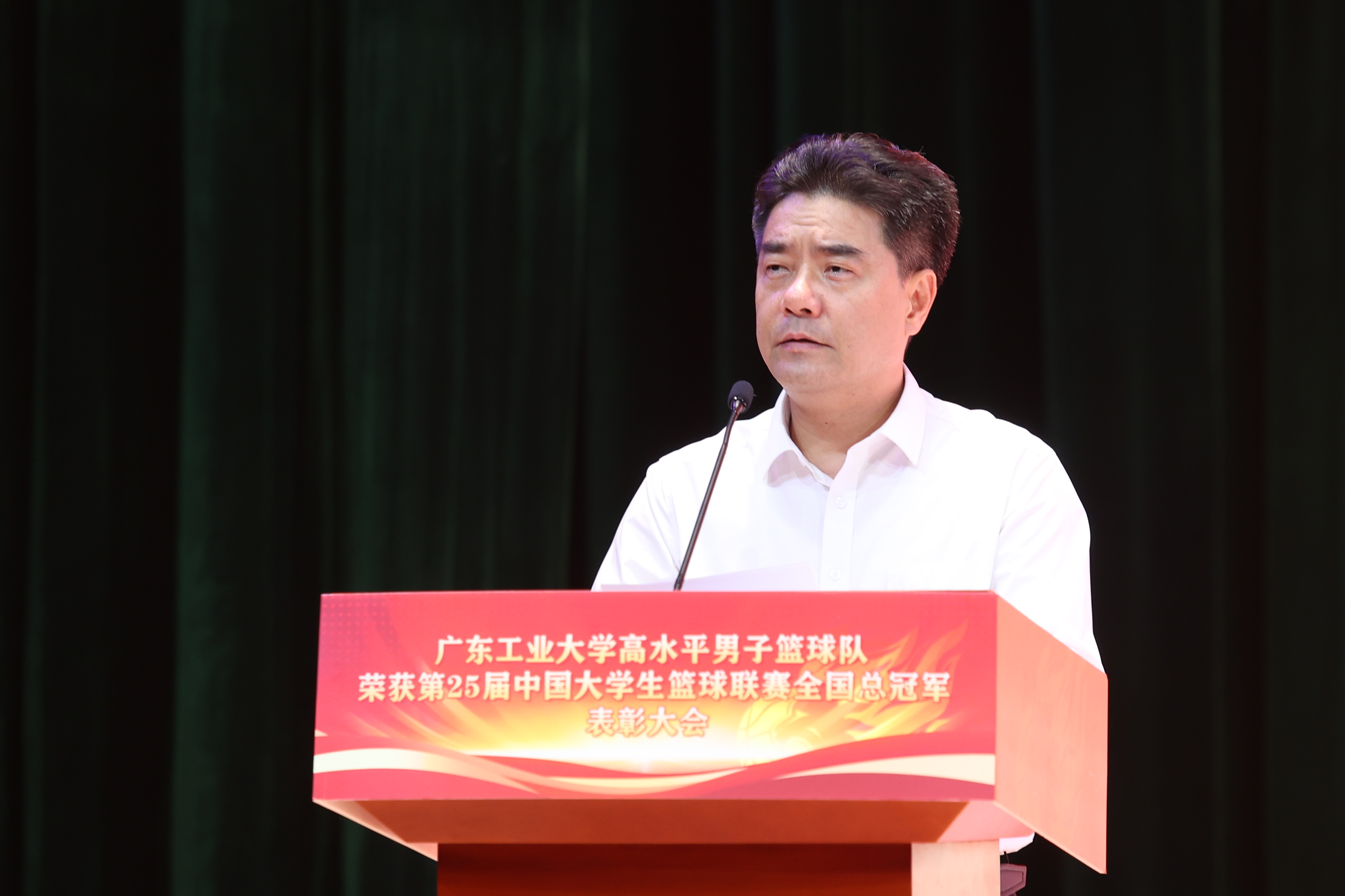 邱学青宣读学校《关于表彰高水平男子篮球队的决定》。学校男篮是新时代广工青年集体的优秀代表。他们展现了脚踏实地、笃行不怠的实干品格,迎难而上、追求卓越的拼搏精神,敢于胜利、为校争光的进取特质,以强烈的历史主动精神寻求突破和超越。为弘扬学校男篮精神,经学校研究决定,授予广工男子篮球队“8xbet网先进集体”称号。学校希望全体师生以男子篮球队为榜样,踔厉奋发、勇攀高峰,为全面推进高水平创新型大学建设作出新的更大贡献,为全面建设社会主义现代化国家、全面推进中华民族伟大复兴而团结奋斗。