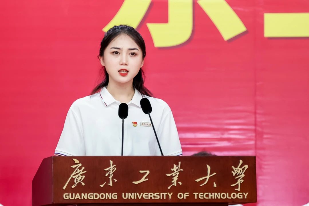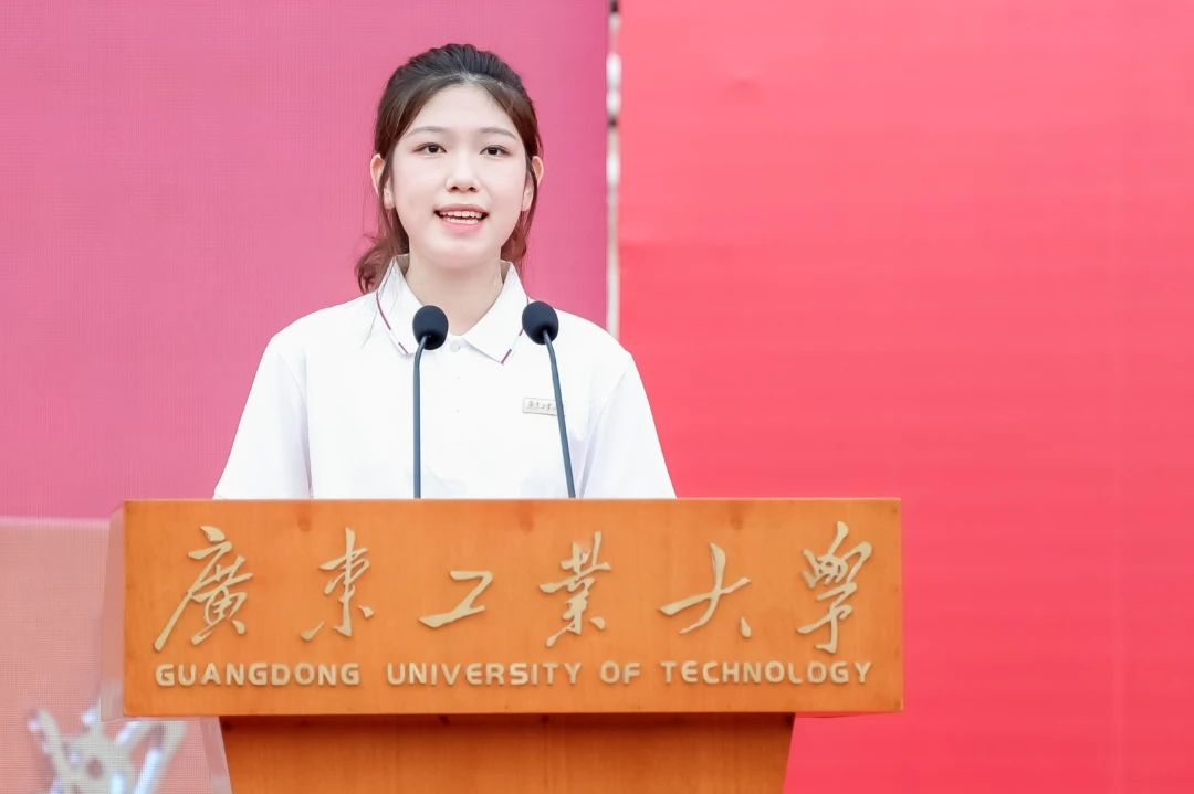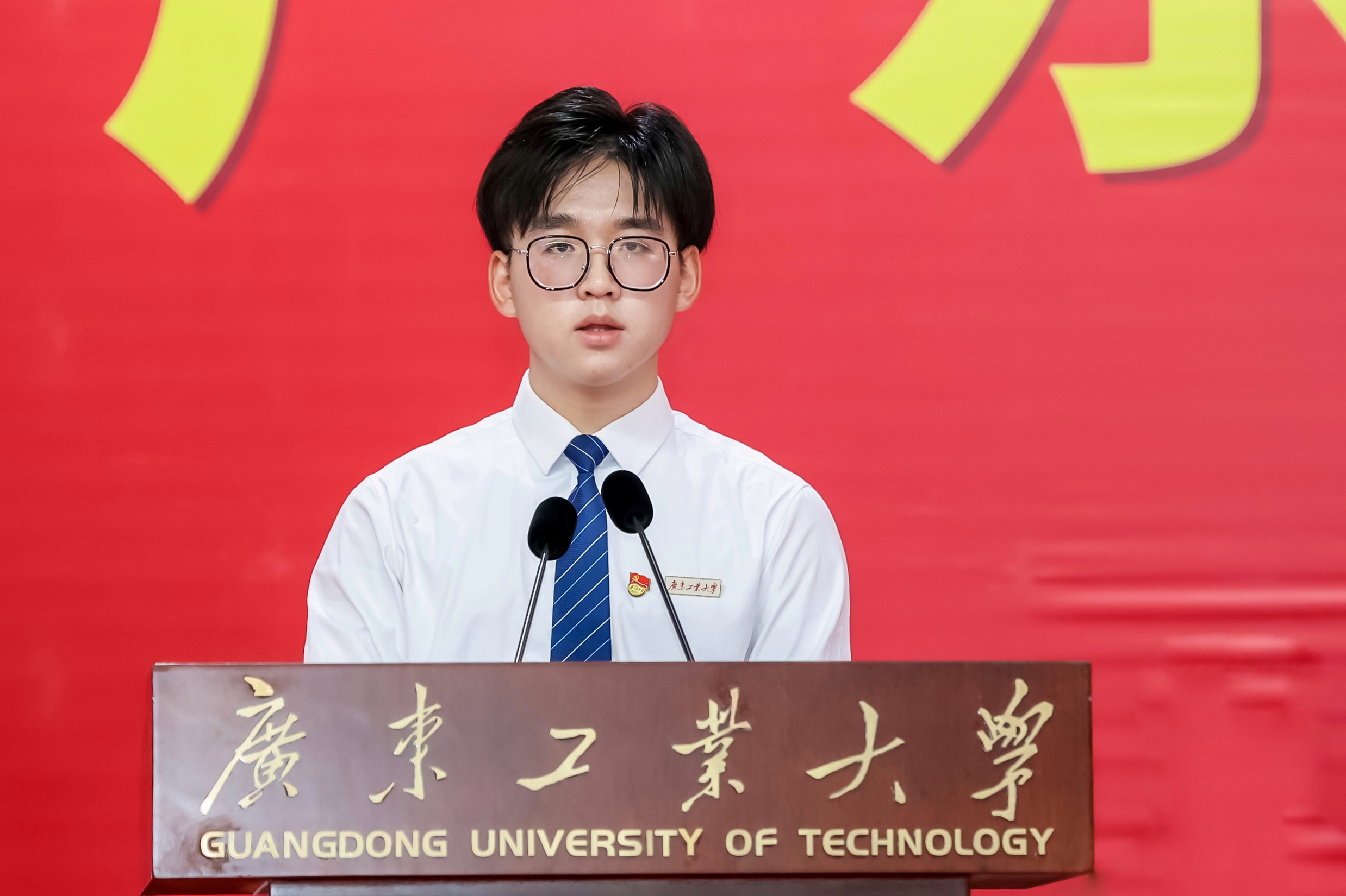 材料与能源学院本科新生周千愉代表发言。她表示,是广工严谨认真的求学态度、勇于突破的创新勇气、“敢于拼搏、敢于胜利”的“攀撑”风采让她立下报考志向,愿做“有为”的广工人,为学校荣耀再添一份力。