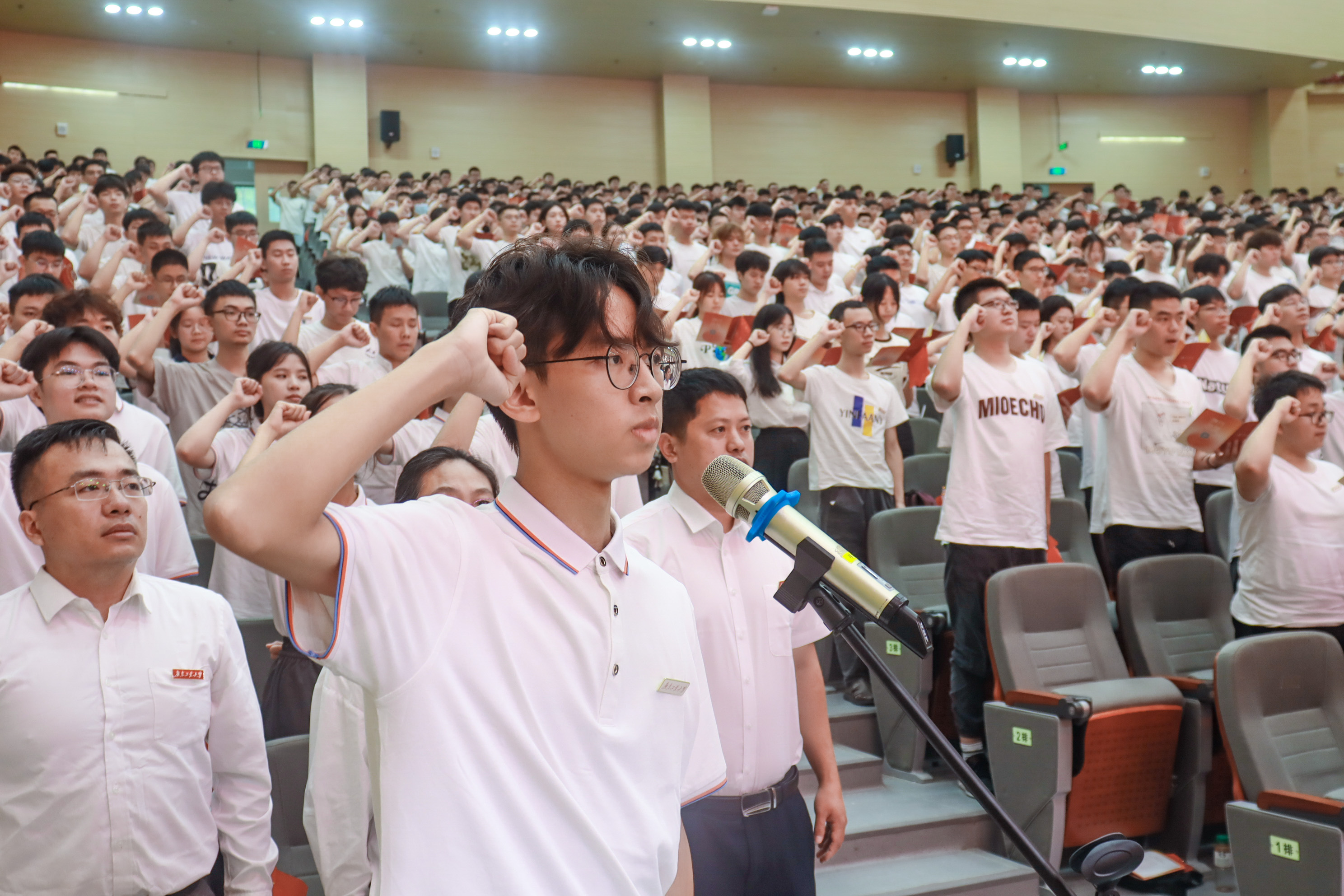 “我宣誓:坚定信念,牢记使命;热爱祖国,遵纪守法……”典礼上,全体新生举起右拳、郑重宣誓,誓言字字铿锵,是广工精神的传承与坚守,亦是使命担当的牢记与践行。