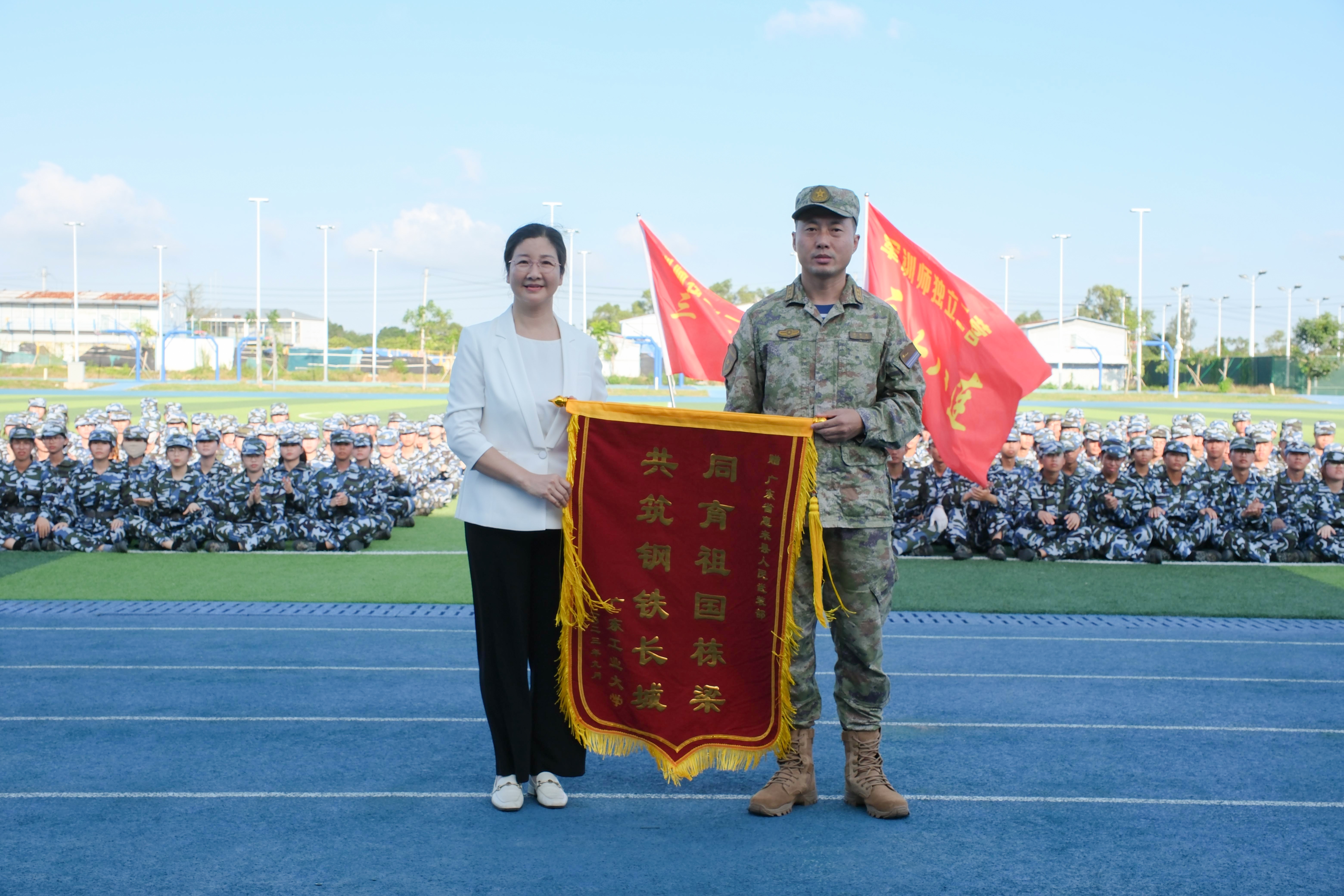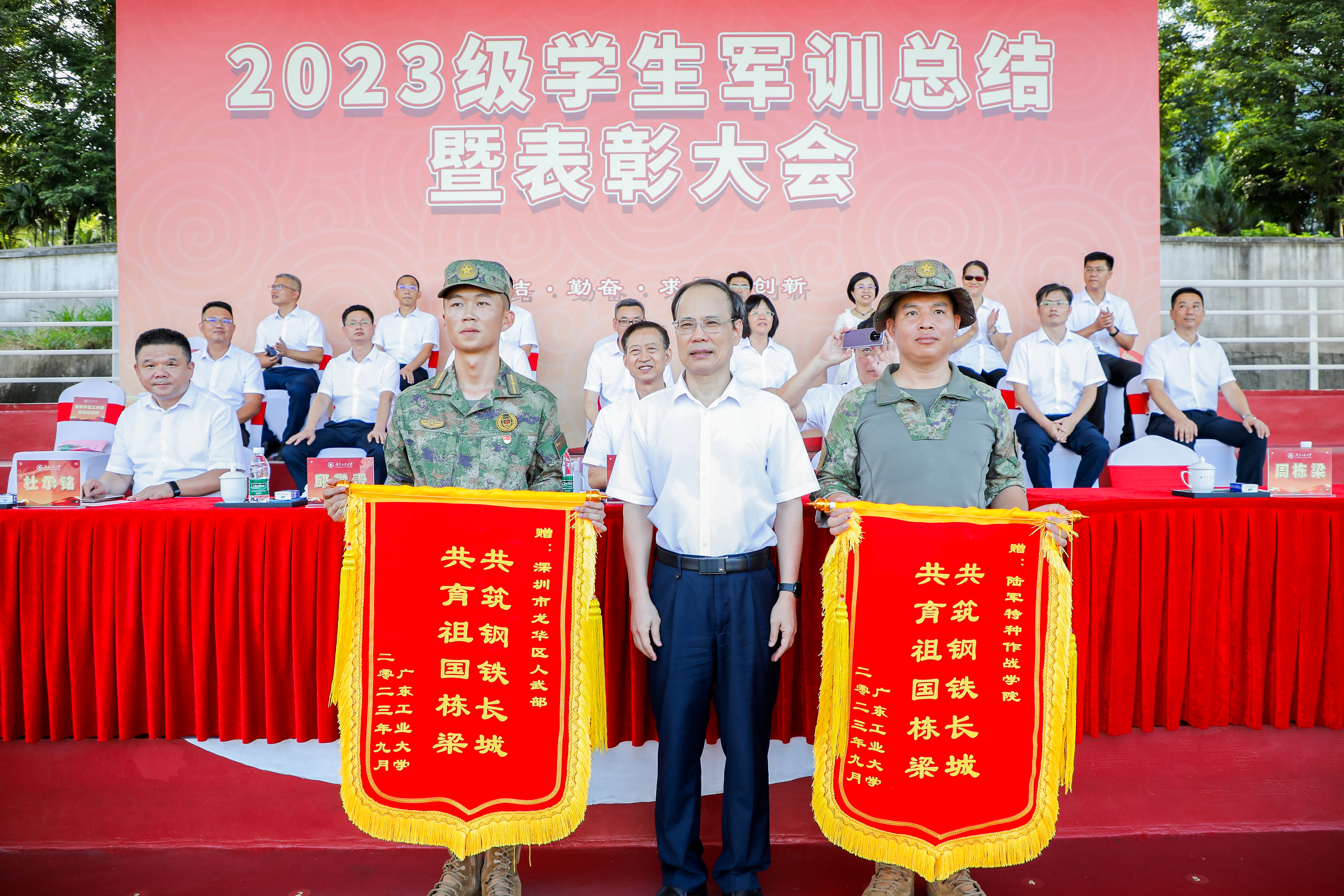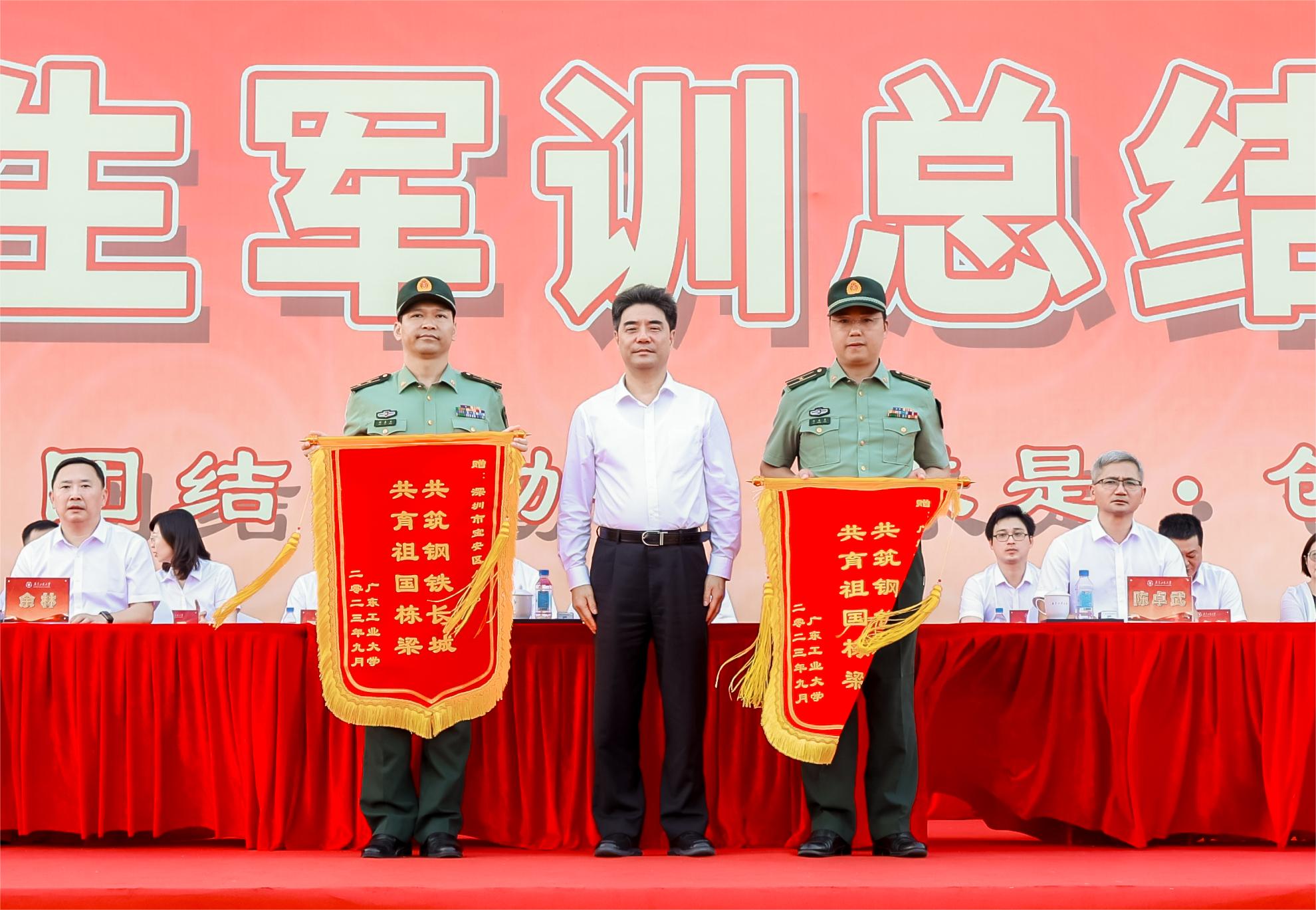 大会在雄壮的国歌声中拉开帷幕。“同学们好!”“同学们辛苦了!”胡钦太、邱学青、朱蔚蔚分别在三校区向教官和新生表示慰问,并向承担本次军训任务的深圳市宝安区人民武装部、广州市白云区人民武装部、深圳市龙华区人武部、陆军特种作战学院、惠来县人民武装部赠送锦旗。