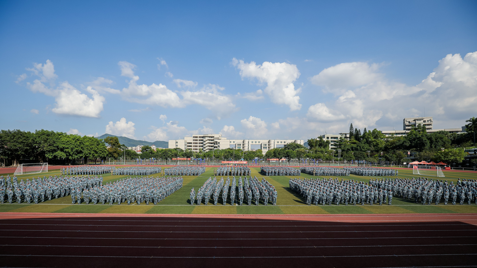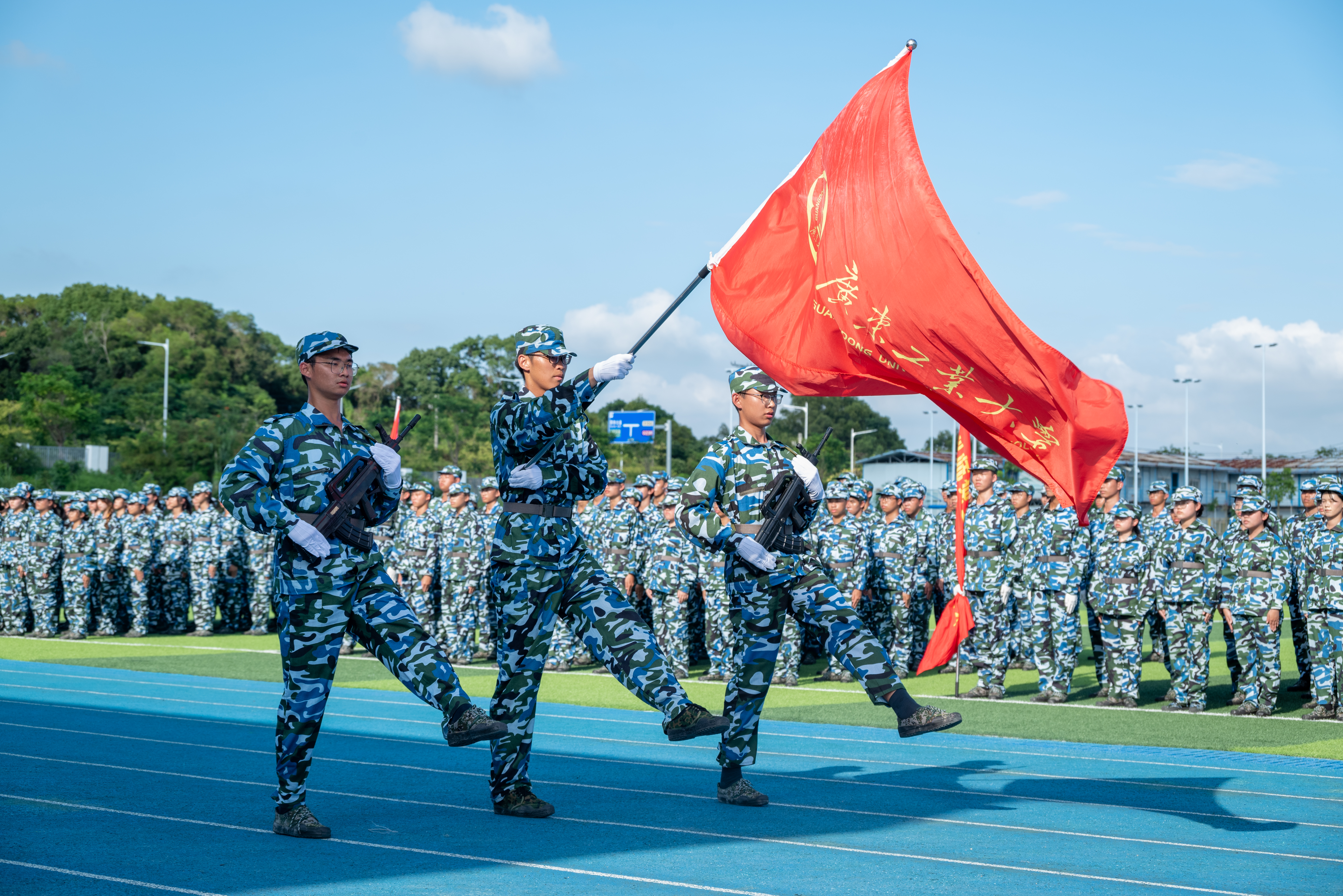 热血铸军魂,青春正当时。9月24日下午,8xbet网2023级学生军训总结暨表彰大会在大学城校区、龙洞校区和揭阳校区举行,东风路校区同学在龙洞校区参会,番禺校区同学在大学城校区参会。一万余名新生经过14天的淬炼与蜕变,以威武的军姿、崭新的风貌、昂扬的精神展示军训成果。