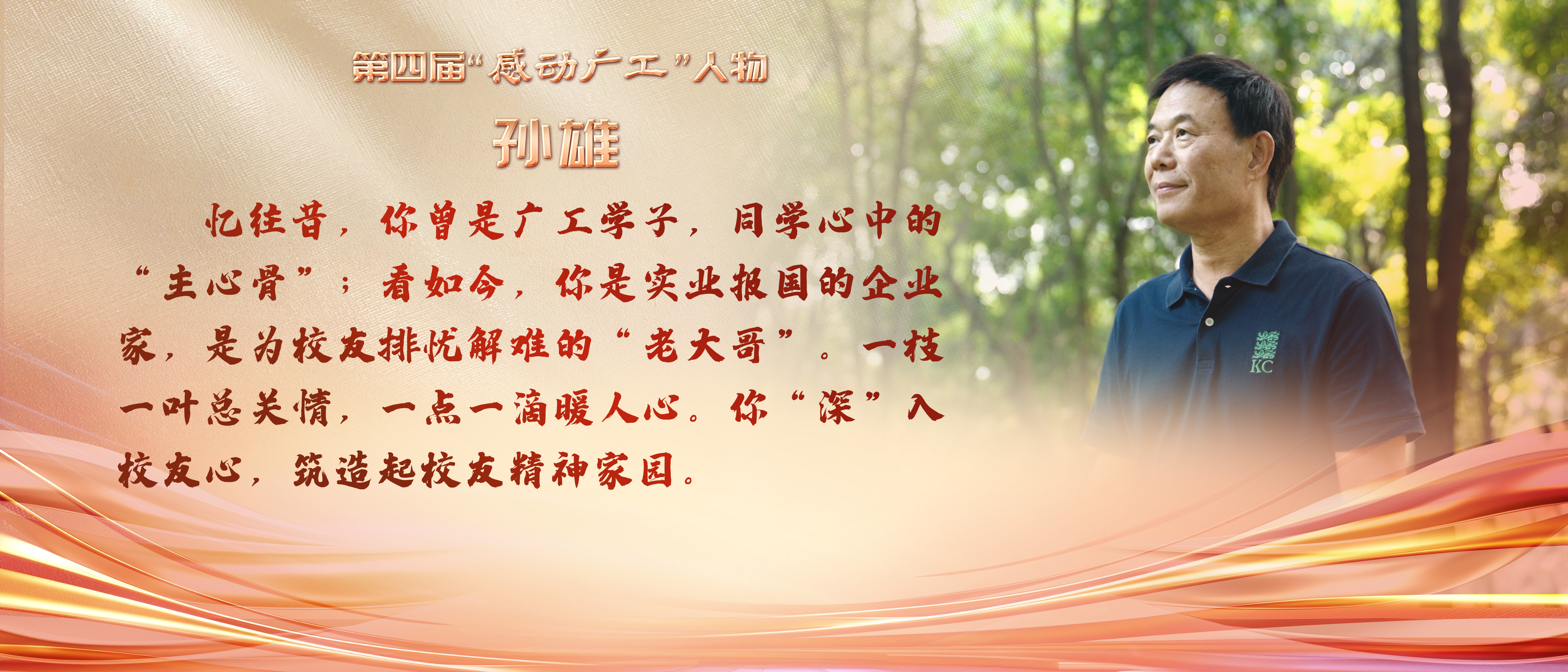 颁奖盛典分为追寻、涌泉、耕耘、登场四个篇章,通过感动事迹展播以及采访、文艺演出等形式生动再现了10位感动人物(群体)动人事迹和心路历程。“要高山低头、令江水倒流”的精神丰碑东深供水工程建设群体,广工跨越式发展的拓路人陈年强,潜心工艺创新的匠心师者陈焰基,筑造校友精神家园的“领头雁”孙雄,深耕打造国货之光的先行者黎庆恺,用心育“芯”创新人才自主培养的领军人熊晓明,病痛不阻热爱敬业立学的“大先生”李晓端,跨越山海、扎根广工的湾区教育者凌永权,聚焦青创军创的“甜橙”少年张博爱,团结拼搏勇攀高峰的“冠军之狮”的广工高水平男子篮球队,他们有信仰、有大爱、有力量,在广工的历史岁月中留下动人故事。