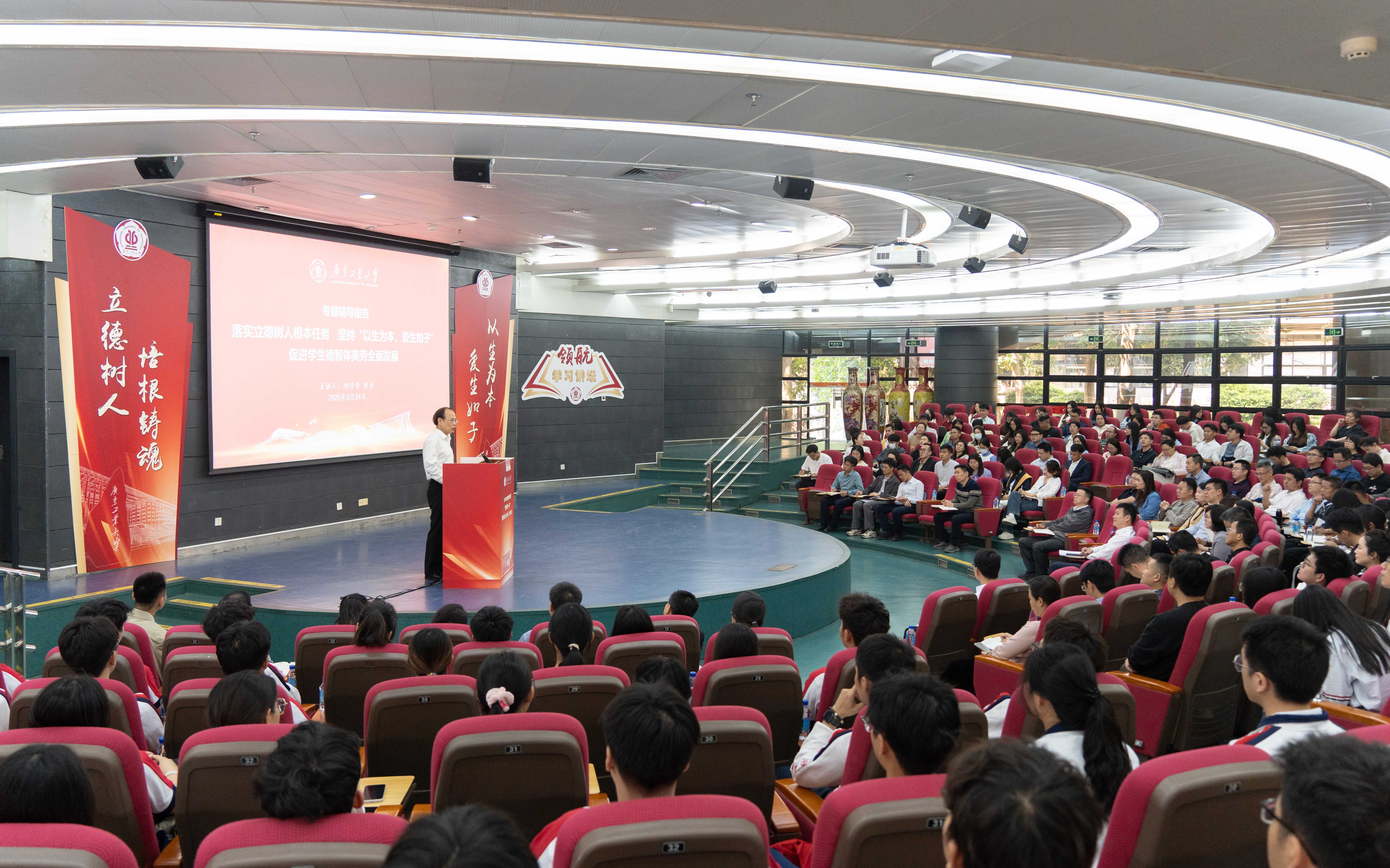 3月24日下午,学校在大学城校区大讲堂二楼圆弧报告厅组织开展2025年春季学期“思政第一课”暨领航学习讲坛(第9期),学校党委副书记、校长邱学青教授以“落实立德树人根本任务,坚持‘以生为本、爱生如子’,促进学生德智体美劳全面发展”为题作辅导报告,勉励青年师生坚持守正创新、直面挑战、奋勇攀撑,在推进学校高质量发展新征程上展现新担当新作为。在3个多小时的时间里,邱校长金句频出、妙语连珠,以渊博的知识、鲜活的案例与翔实的数据,用心用情为师生上了一堂生动的思政课。现场掌声笑声不断,气氛热烈暖心。