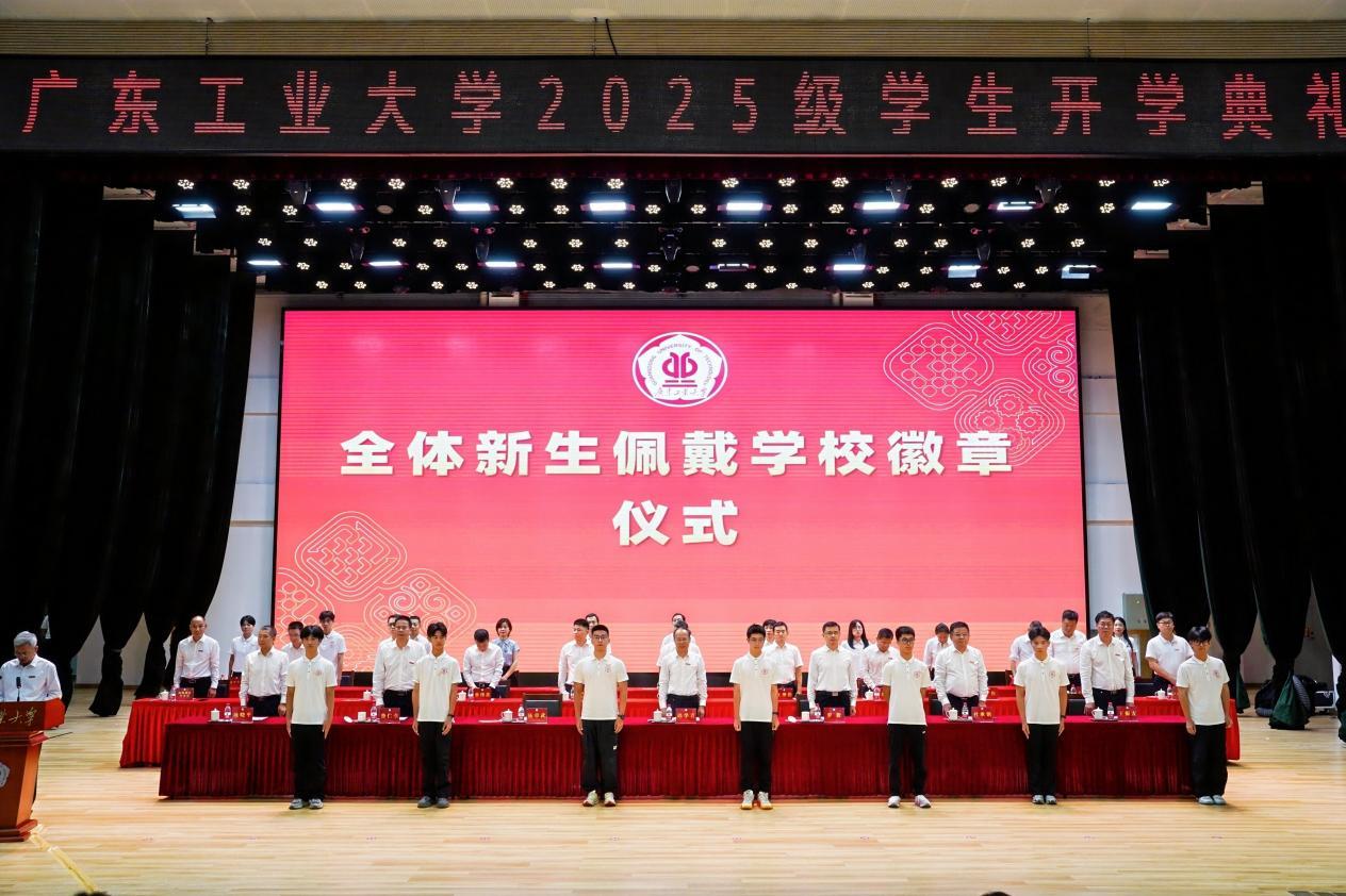 典礼上举行了新生佩戴8xbet网徽章仪式。校领导为新生代表佩戴,新生全体起立,一齐佩戴徽章,胸前徽章闪耀,激励着新生们将“团结、勤奋、求是、创新”的校训精神内化于心,外化于行。典礼上还进行了新生入学宣誓仪式,誓言铿锵,展示了广工学子昂扬向上的精神风貌。