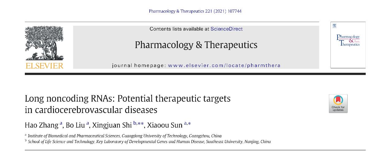 本网讯 近日,广工生物医药学院孙晓鸥老师在Pharmacology & Therapeutics杂志上发表论文,对长链非编码RNA(Longnon-codingRNA,lncRNA)在心脑血管中的功能进行了系统的总结。论文第一作者系生物医药学院出站博士后张昊博士,通讯作者为我院孙晓鸥老师和东南大学青年教师史兴娟。