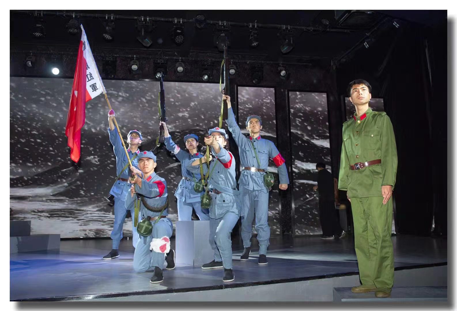 戏剧《一顶红军帽》为学校戏剧团郭娜老师编导的原创作品,该剧以历史上的红军长征为背景,讲述小战士胡英子在指导员的帮助下最终成长为一名优秀的共产党员的故事。作品以小见大、托物言志,通过一顶红军帽的承继,形象地刻画了红军精神的代代传承,以戏剧为载体结合音乐、形体、灯光等多种艺术手法,为当代青年学子学习党史、担负使命提供了一个生动的时代范本。
