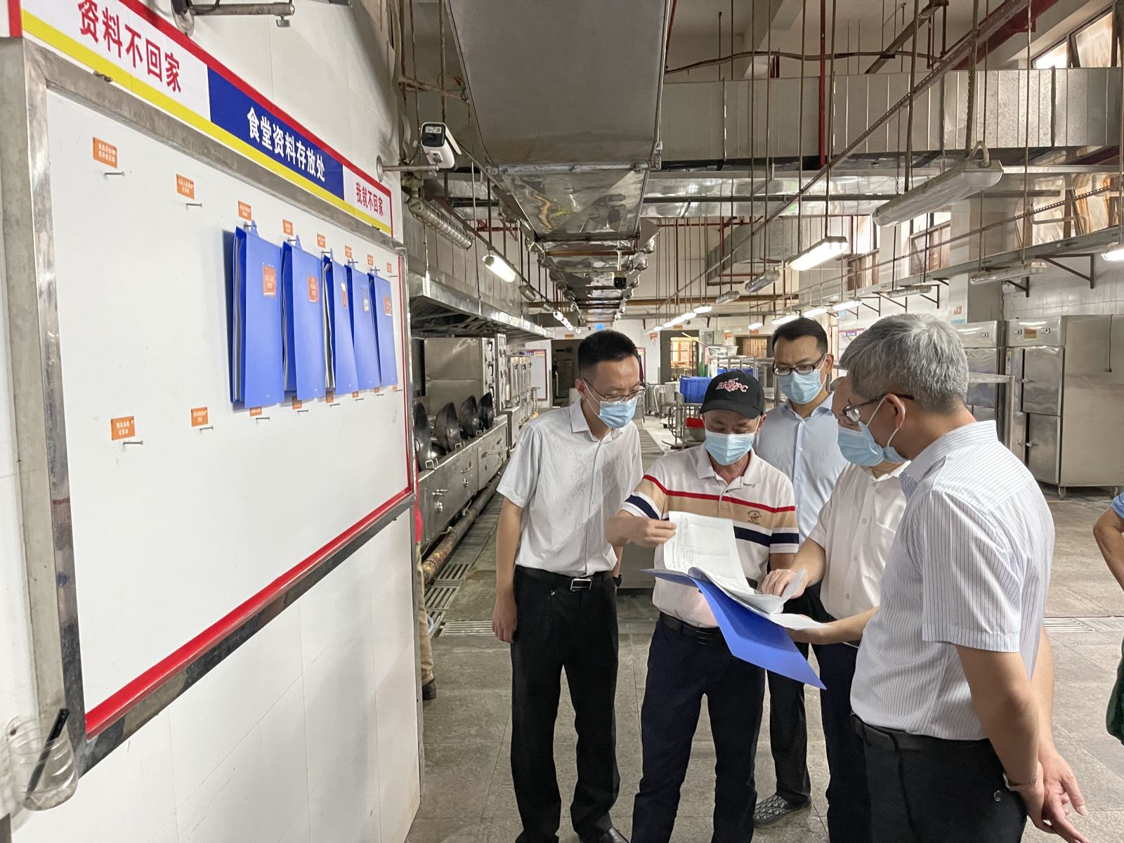最后,陈卓武、阳爱民来到东二(1)楼暑期值班食堂,检查食堂入口查温、消毒设备,排队就餐标识指引,食品卫生、消防设施、食堂台账等,了解暑假期间就餐人数和供应情况。要求完善食堂防控标识指引,加强食堂清洁消毒,强化食材索票索证,严格冷链食品管控,丰富供应菜式品种,为师生提供安全、充足、优质的餐饮服务。