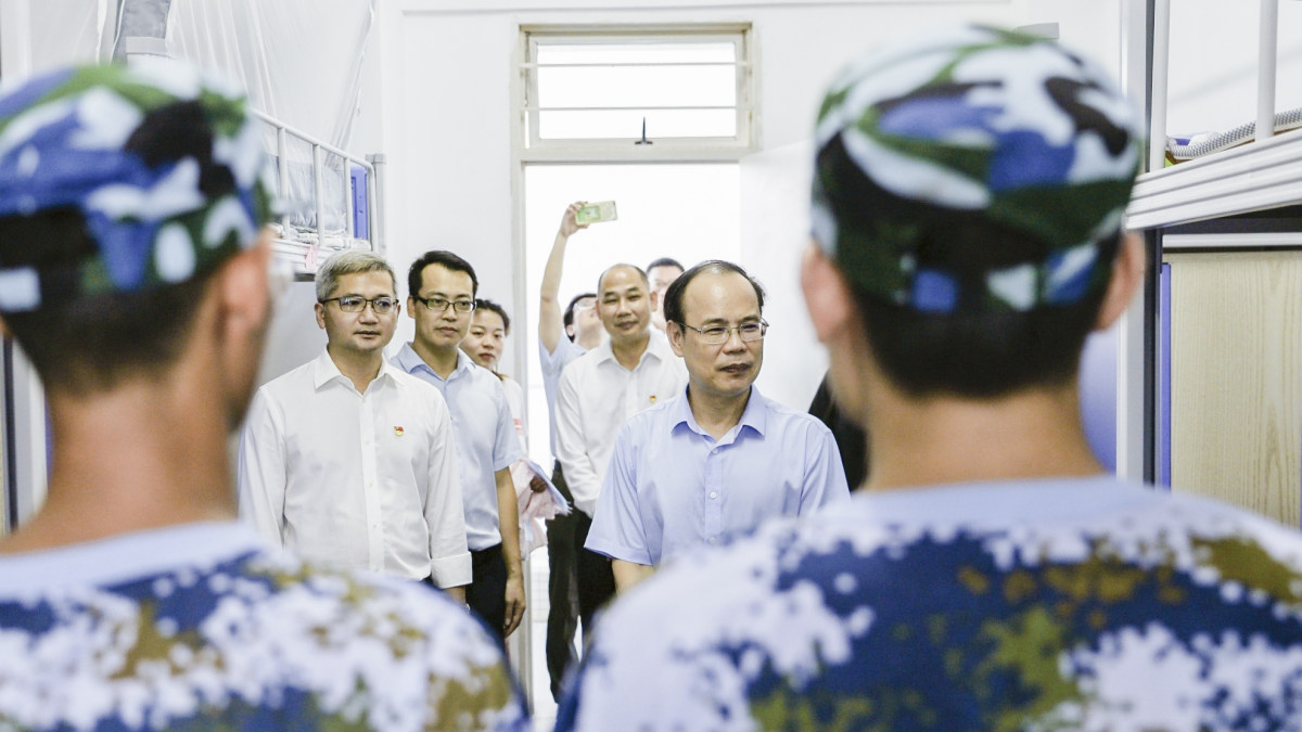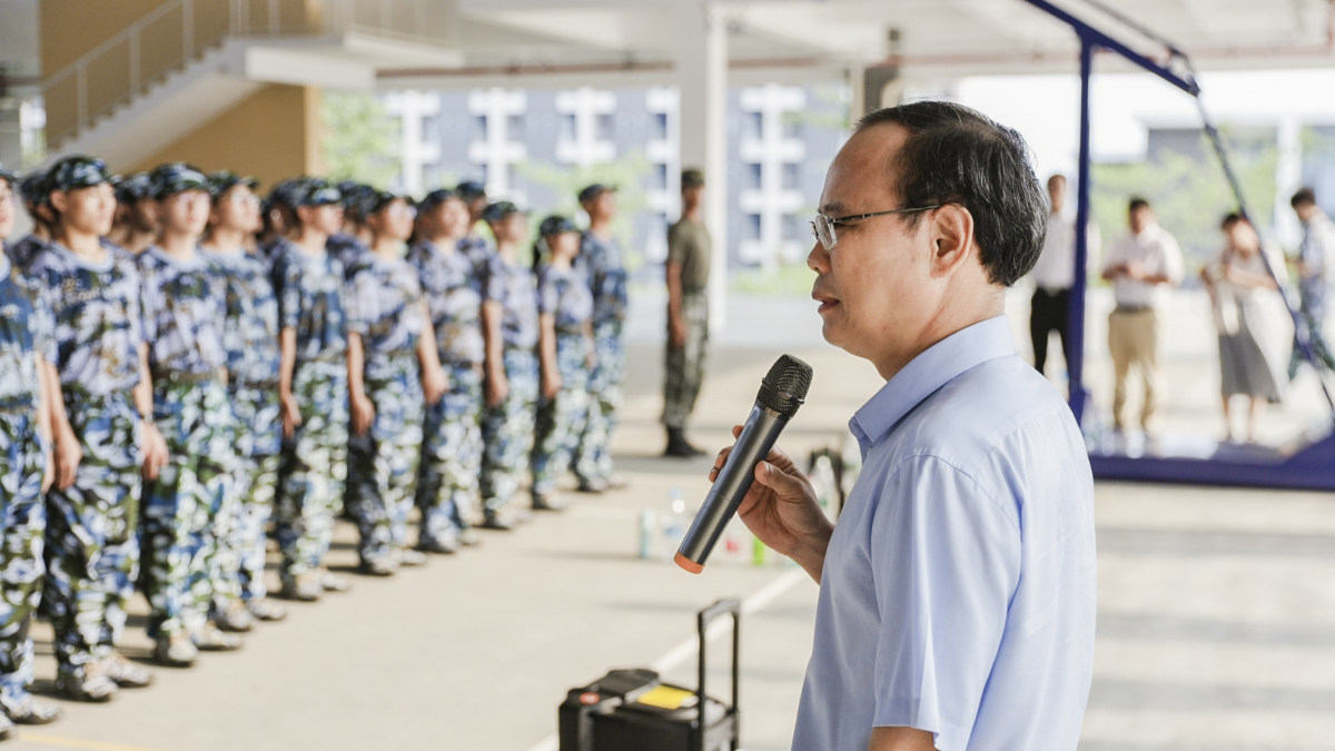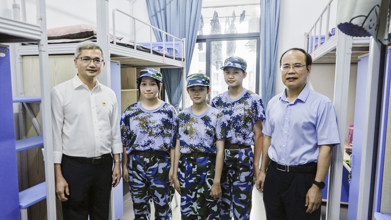 9月17日下午,校长邱学青,副校长陈卓武来到揭阳校区,深入训练场、学生宿舍等地看望慰问正在参与军训的2021级新生。
