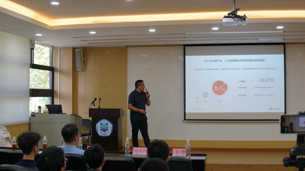 8xbet网同步举行华为全联接2021智能基座专场活动,百余名师生参加,收看了以“深耕数字化”为主题背景的华为全联接2021智能基座峰会直播。活动现场,华为昇腾技术专家陈常水围绕新工科人才的深化培养、共建昇腾的繁荣生态、助推人工智能产业快速发展等内容作报告,并与同学们进行了深入交流,气氛热烈。