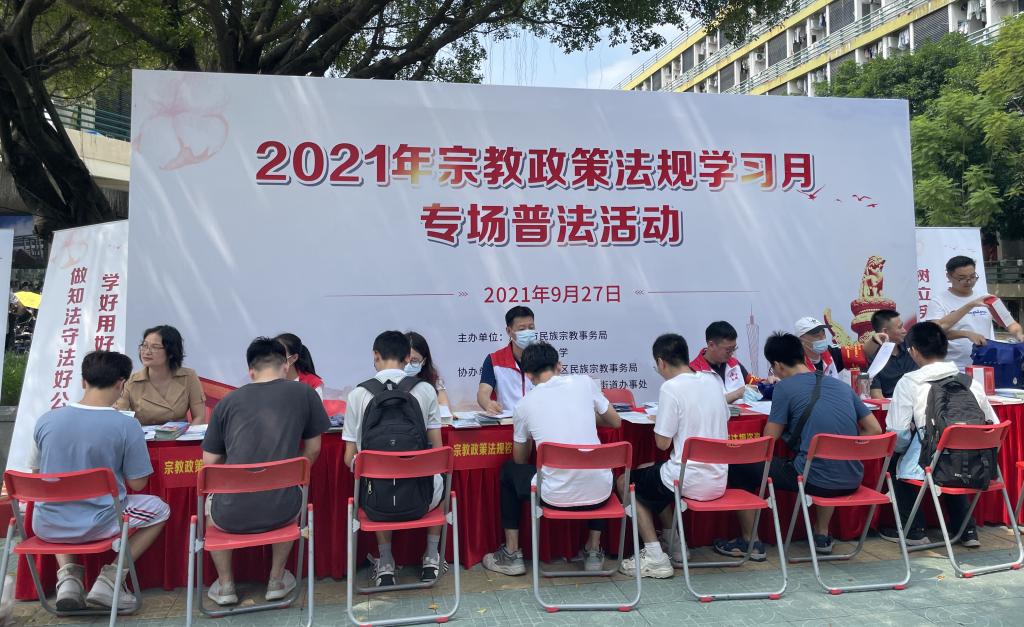 9月27日中午,广州市民族宗教事务局在学校大学城校园第二饭堂门口开展了宗教政策法规学习月普法专场活动。广州市民族宗教事务局政策法规处处长陈敬华,番禺区委统战部副调研员齐国勇,学校党委常委、组织部、统战部部长李靖茂以及相关部门干部到现场开展宣传活动。