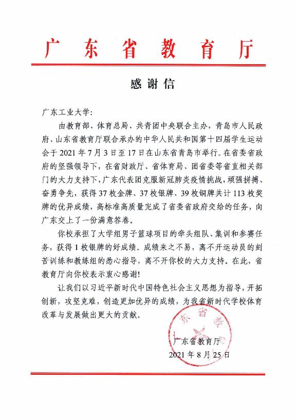 据悉,由教育部、国家体育总局、共青团中央联合主办,青岛市人民政府、山东省教育厅联合承办的中华人民共和国第十四届学生运动会于2021年7月3日至17日在山东省青岛市举行。我校承担了大学组男子篮球项目的牵头组队、集训和参赛任务,获得1枚银牌的好成绩,广东省教育厅特向我校发来感谢信;另外,我校男子足球队和乒乓球队的教练员和运动员也参加了集训和参赛任务,取得了大学组男子足球项目银牌和大学组乒乓球项目男子团体第七名的好成绩。