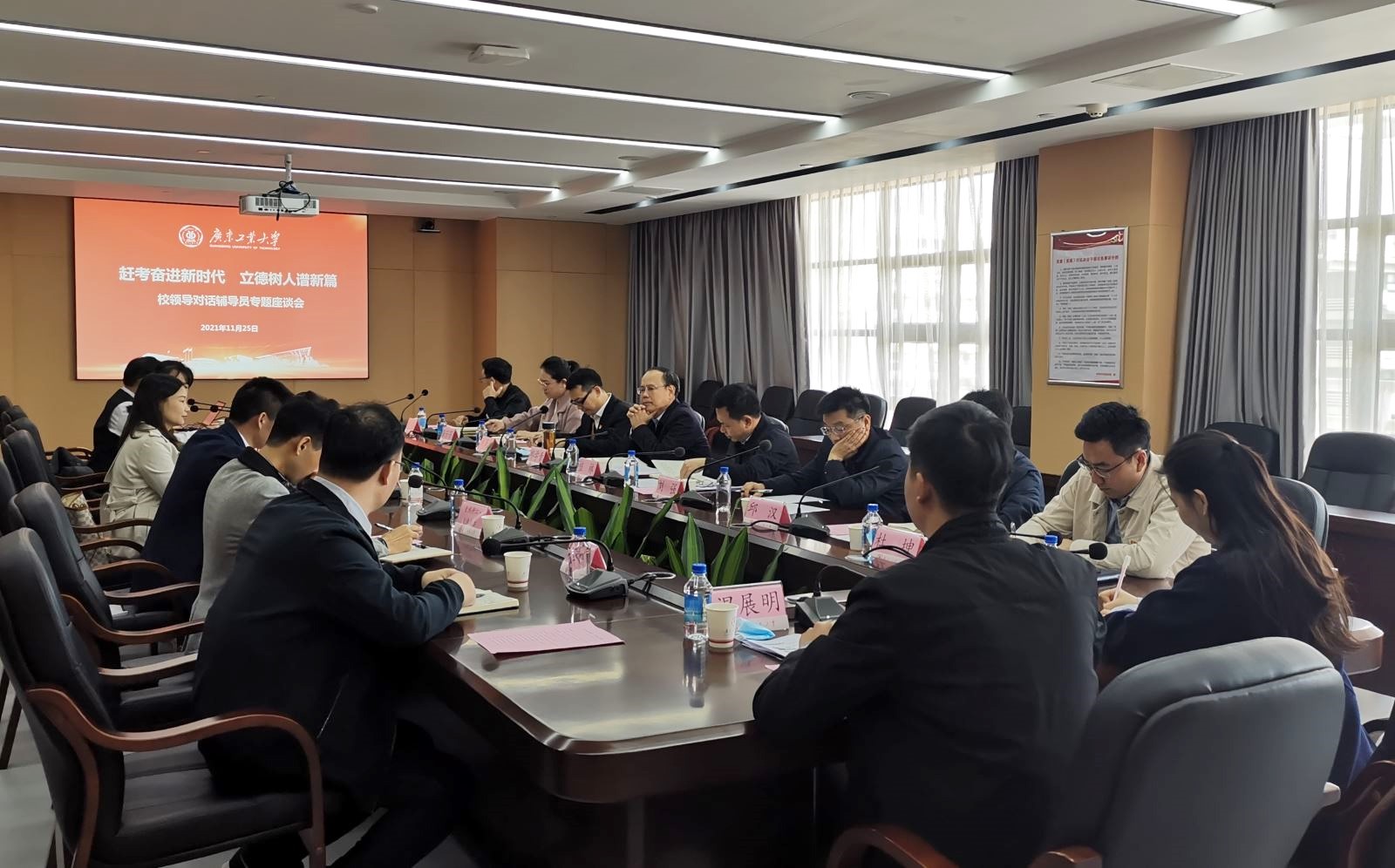 为进一步了解我校辅导员的工作生活情况,加强对辅导员的思想引领与人文关怀,推动辅导员队伍建设提质增效,11月25日上午,学校在大学城校区行政楼702会议室举行“赶考奋进新时代,立德树人谱新篇”专题座谈会,校长邱学青与来自各学院的辅导员代表进行交流。学校党委办公室、校长办公室、党委学生工作部、党委教师工作部负责人参加座谈会。