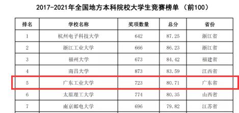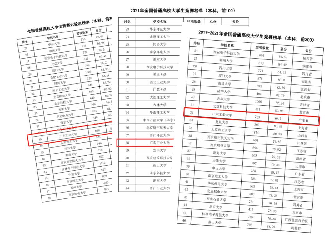 2月22日,中国高等教育学会发布了全国普通高校大学生竞赛分析报告,榜单类型包括近五年(2017-2021)大学生竞赛排行榜、六轮总榜单、单一年度(2021年)排行榜、地方院校排行榜等。在近五年(2017-2021)数据榜单中,位居全国第32位,与上一轮五年数据相比排名提升了4位,在广东省内排名第二;在连续六轮的总榜单中,广工排名稳居全国第39位,在广东省内排名第三;在单一年度榜单中,广工排名为38位,广东省内排名第二;在地方本科院校排行榜中,广工排名全国第五。