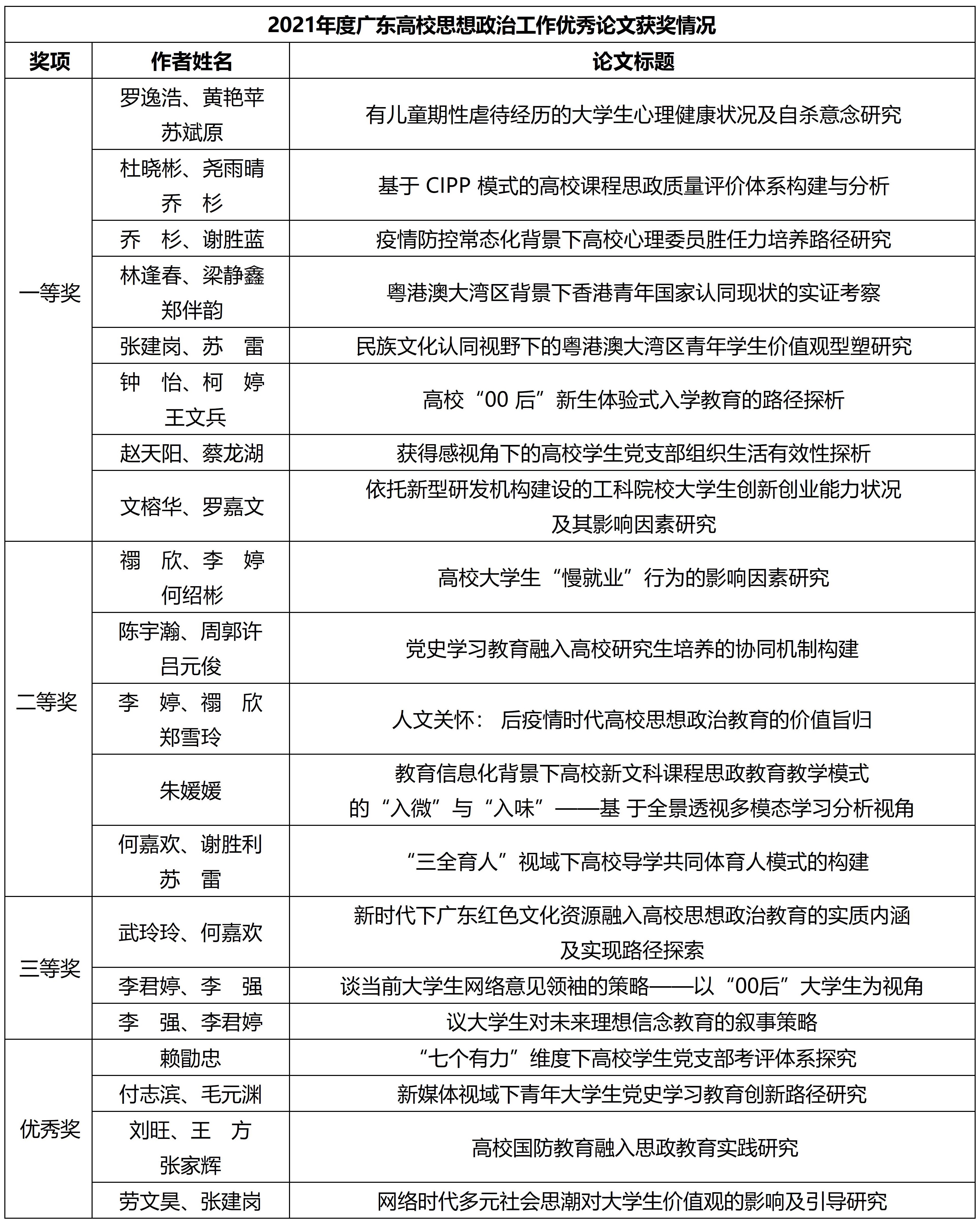 近日,由高校思想政治工作队伍培训研修中心(华南师范大学)、教育部高校辅导员培训和研修基地(华南师范大学)、广东省高等学校思想政治教育研究会组织开展的2021年度广东高校思想政治工作优秀论文征集评选活动和学生工作案例评优活动的评选结果揭晓。8xbet网在评选中获佳绩,获奖数量创我校历年新高。其中,学校辅导员获广东高校思想政治工作优秀论文一等奖8项、二等奖5项、三等奖3项、优秀奖4项;学生工作案例获广东省一等奖2项、二等奖9项、三等奖3项、优秀奖1项。