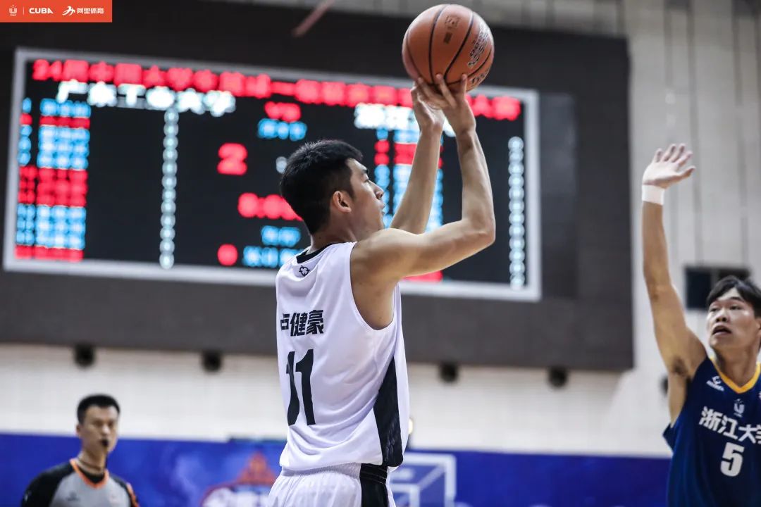 第二节比赛开始,广工在进攻端多点开花,陈国豪接郭枭灿助攻完成空切上篮得分。浙大调整了战术,挡拆后分球给空位的11号球员荣家浩在底角命中一记三分,虽然大比分领先但是广工的主教练还是叫暂停做出调整。暂停过后广工加快了进攻的节奏,攻防转换也非常快,让浙大的内线策应战术打不出来。半场下来,广工已经拿下了28个篮板,并带着27分的领先优势结束上半场。