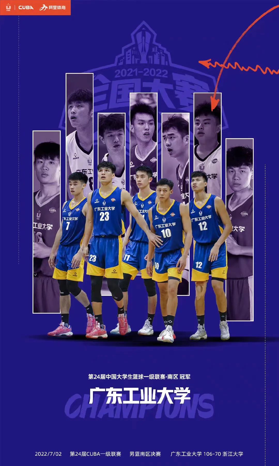 7月2日晚,在海南海口,广工男篮南区决赛会面浙大男篮,广工粤狮队以七战全胜的成绩,问鼎南区冠军!