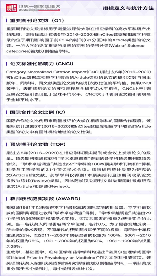 2022软科世界一流学科排名覆盖54个学科,涉及理学、工学、生命科学、医学和社会科学五大领域。排名指标体系包括重要期刊论文数、论文标准化影响力、国际合作论文比例、顶尖期刊论文数以及教师获权威奖项数5个指标,不同学科的指标权重系数有所不同。