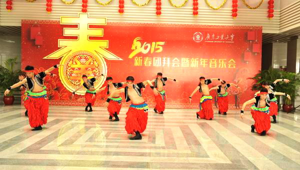 全体校领导以小组唱《革命人永远是年轻》拉开团拜会序幕,祝福广工人永远年轻,学校各项事业朝气蓬勃、欣欣向荣。交响管乐团、教务处、工会、离退休处、学生合唱团、学生舞蹈团、党群工会等奉上了一场丰富多彩的文艺演出,演奏、独唱、歌曲串烧、群舞、小组唱、男子群舞、歌舞等,个个节目精彩纷呈。节目中还穿插了游戏《击鼓接福》。现场呈现喜乐祥和的热闹气氛。