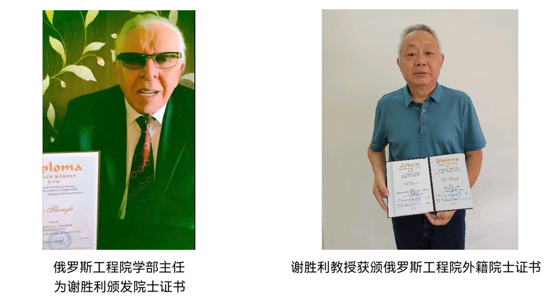 在为谢胜利教授颁发外籍院士证书的会上,俄罗斯工程院学部主任Kuzin院士祝贺他成功当选俄罗斯工程院外籍院士,并介绍道:谢胜利教授依托中国111学科创新引智基地,与俄罗斯工程院院士Kuzin教授和Gorbachev教授长期合作(联合申报中国科技部国际交流合作项目、合作出版专著、联署发表论文、共同申请国际专利等系列国际学术交流)。由于合作成效突出,经Kuzin院士和Gorbachev院士联名推荐,俄罗斯工程院所属学部审查和筛选以及俄罗斯工程院年度院士大会评选,表决通过谢胜利教授为俄罗斯工程院外籍院士。