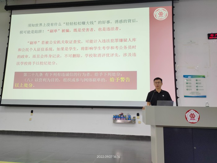 为及时普及校园安全知识,切实提升新生安全防范意识和防范能力,更好守护自身的生命、财产安全,9月4日以来,保卫处与各学院精心组织、紧密协调、通力协作,邀请各分局反诈中心专家、属地社区民警与保卫干部一起通过线上线下、大课小课的方式为2022级新生开展了近40场“安全第一课”校园安全宣传教育活动,范围覆盖本科生和研究生,内容包括校园治安、交通、消防安全及防骗反诈等,取得了良好效果。
