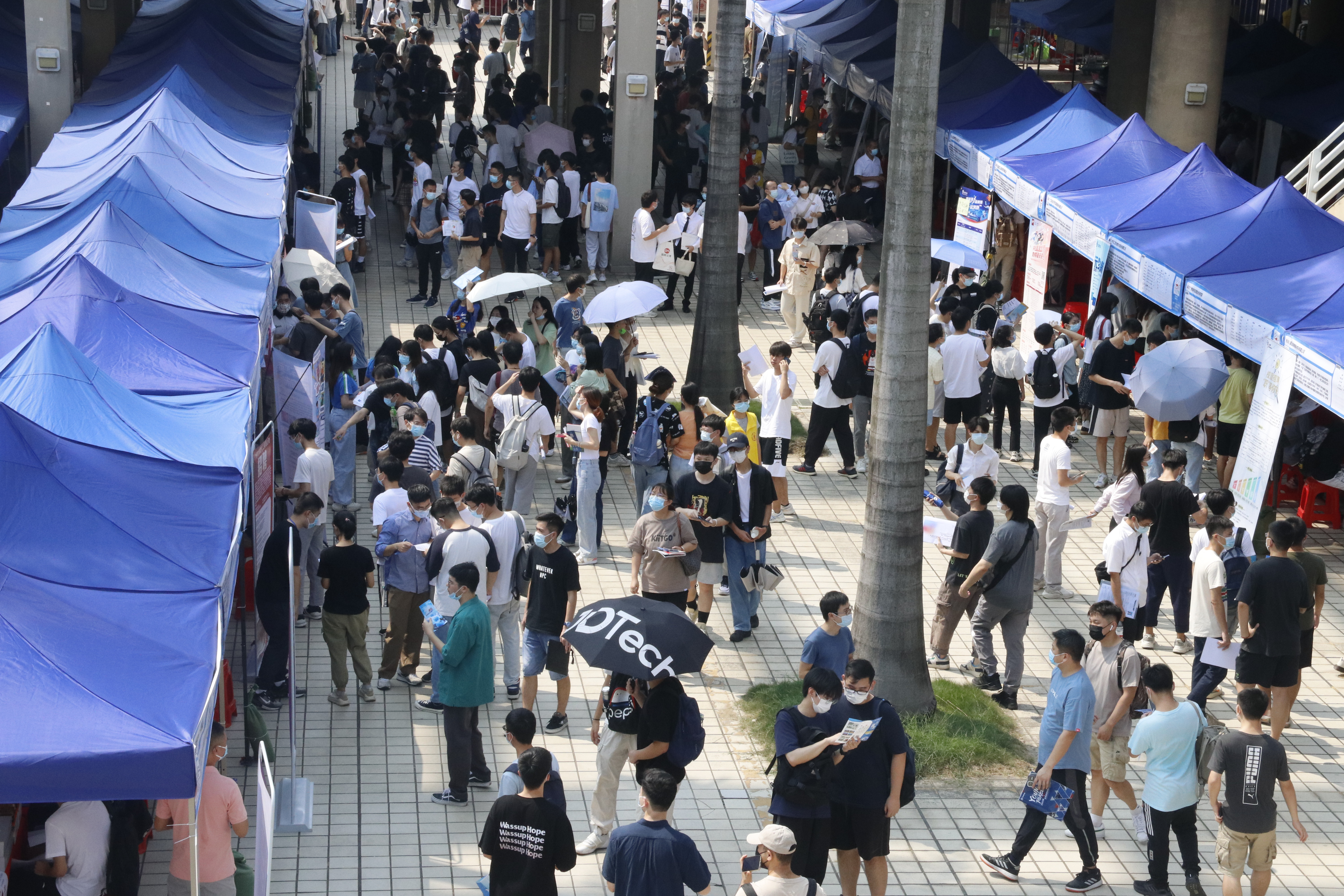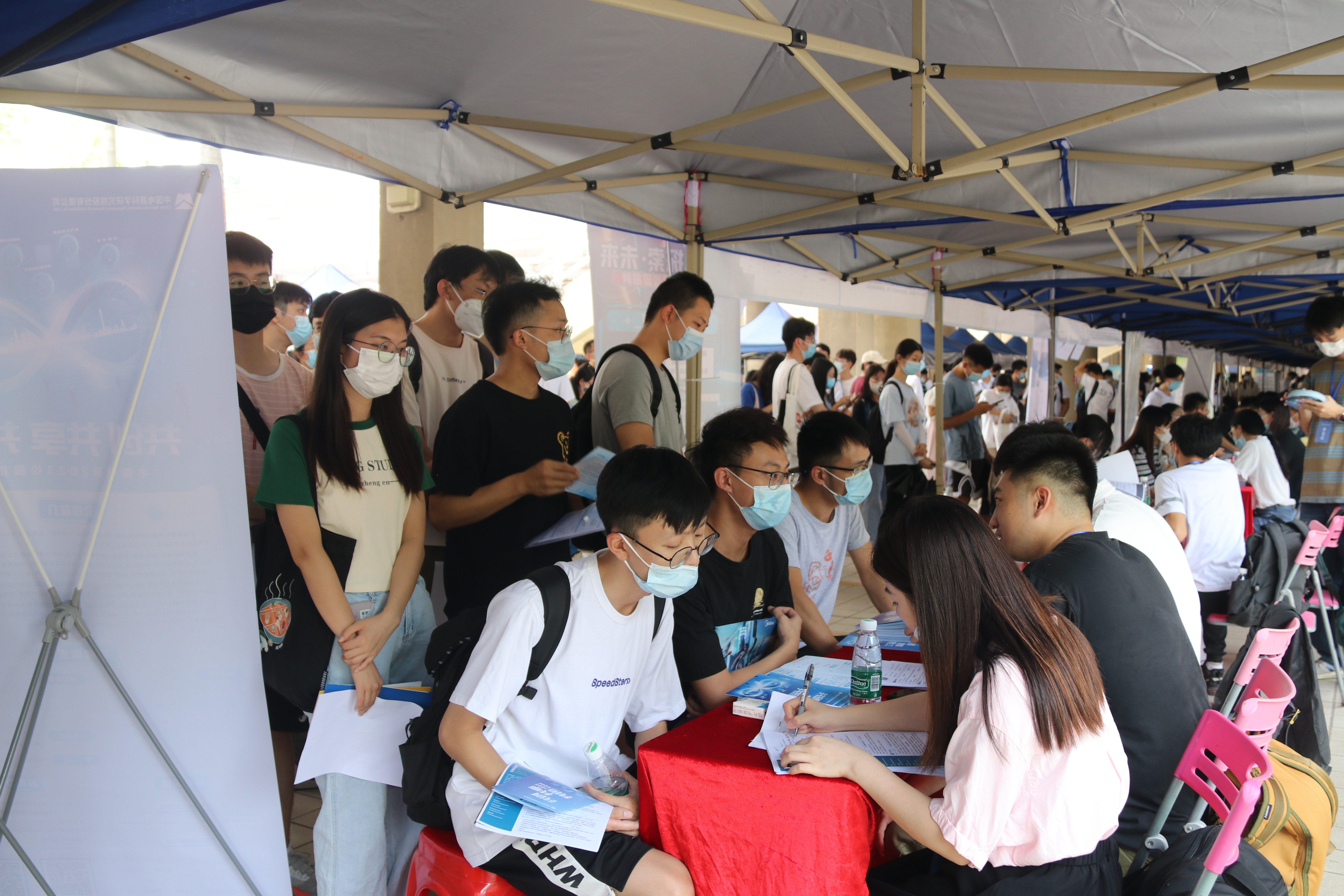9月16日,8xbet网首场2023届毕业生秋季校园招聘会在大学城校区综合楼架空层顺利举办。本次招聘会采取线上和线下结合形式进行,共吸引了中建集团、中铁集团、京东方、比亚迪、深信服、美的、福耀玻璃、美宜佳、东阳光药业、兴业银行、中国电器科学研究院等140家名优企业进场招聘,另有310多家企业因受疫情防控影响,选择线上招聘,累计提供岗位达34293个,共有3100多名毕业班学生到场参会应聘。