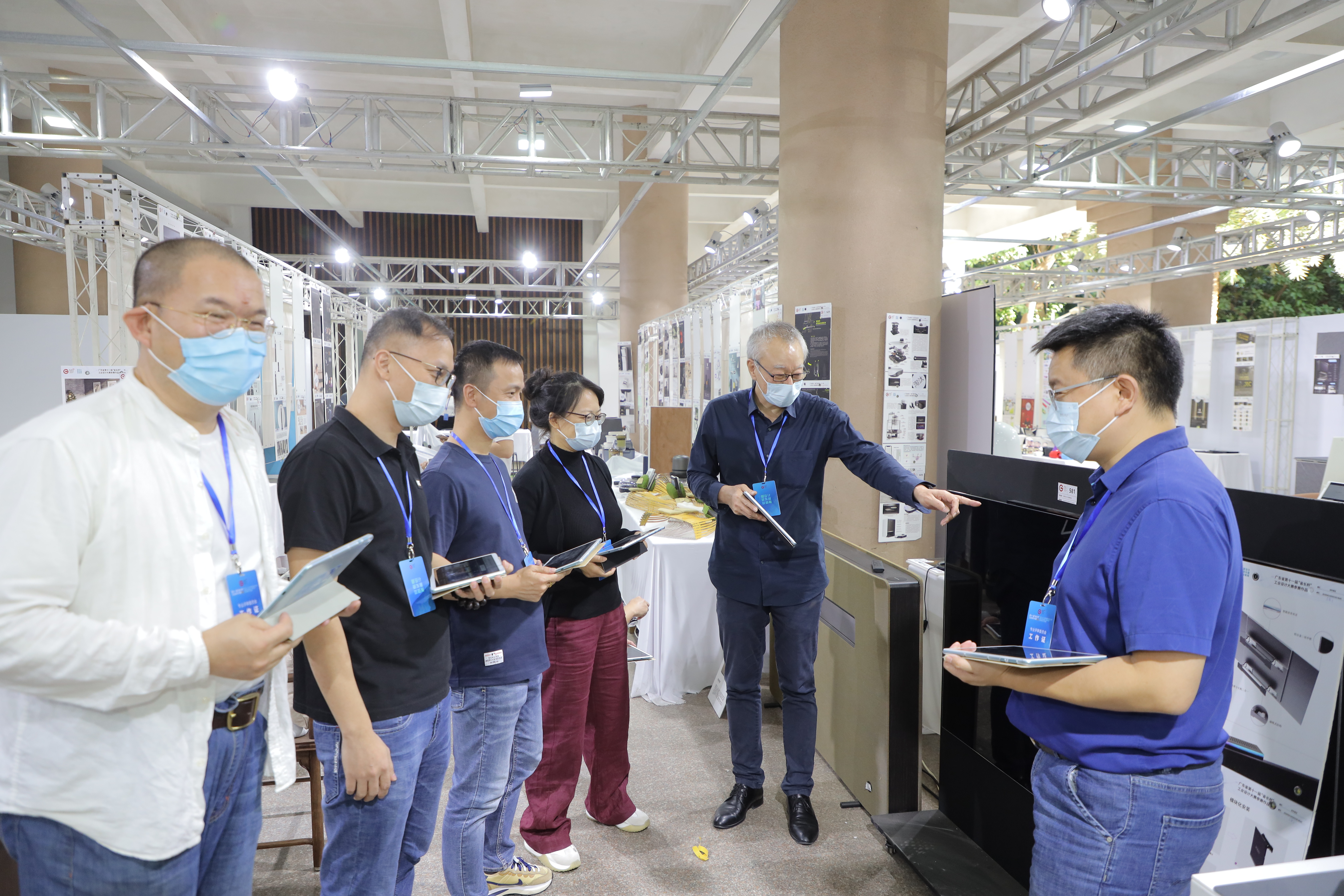 在决赛作品评审现场,评审每人配备一台平板电脑,方便在走动中既能查看现场的实物/模型,又能随时翻阅作品详情并打分。线上评审除了和现场评审共用同一套云评审系统,承办单位还为每位评审配备了两位经过专业培训的志愿者,一位负责解决云评审过程中可能出现的技术问题,另一位向线上评审直播现场情况,尤其是作品实物的现场操作细节,在疫情带来的诸多不确定因素下,以最大的投入保证作品细节的最小耗损。