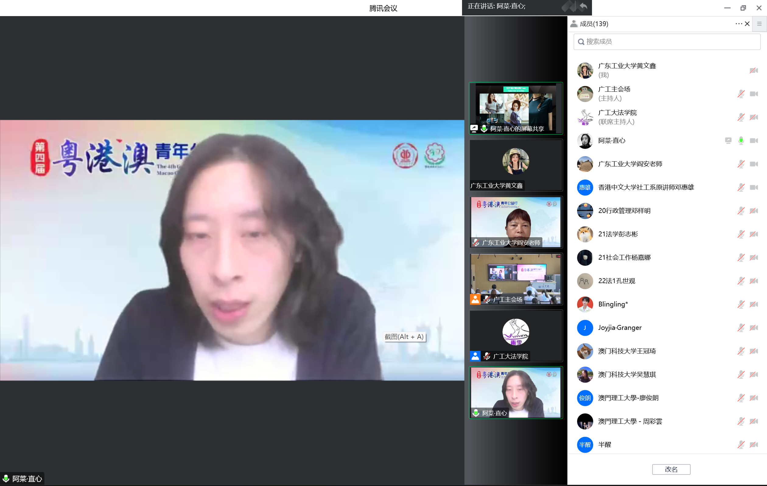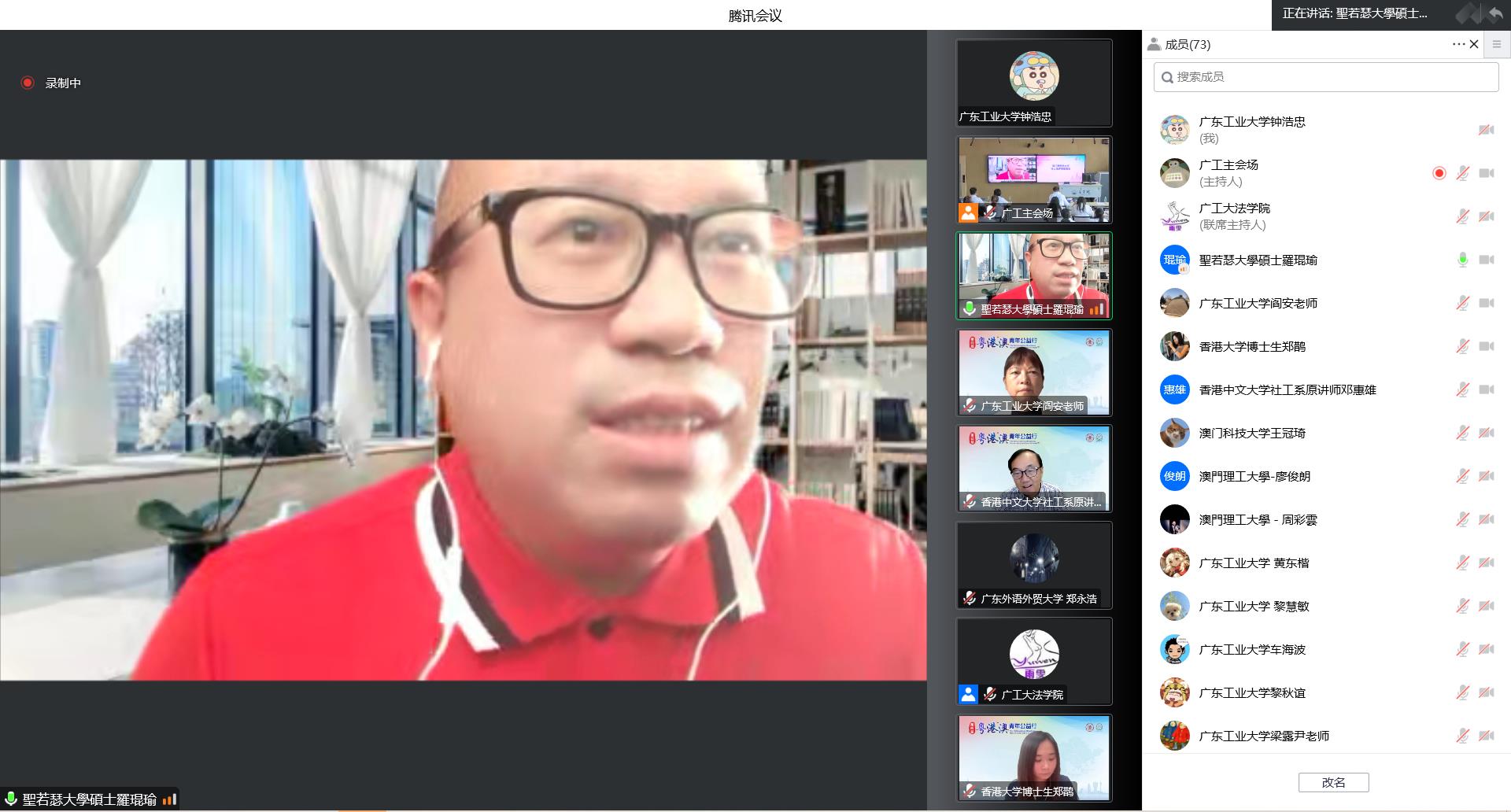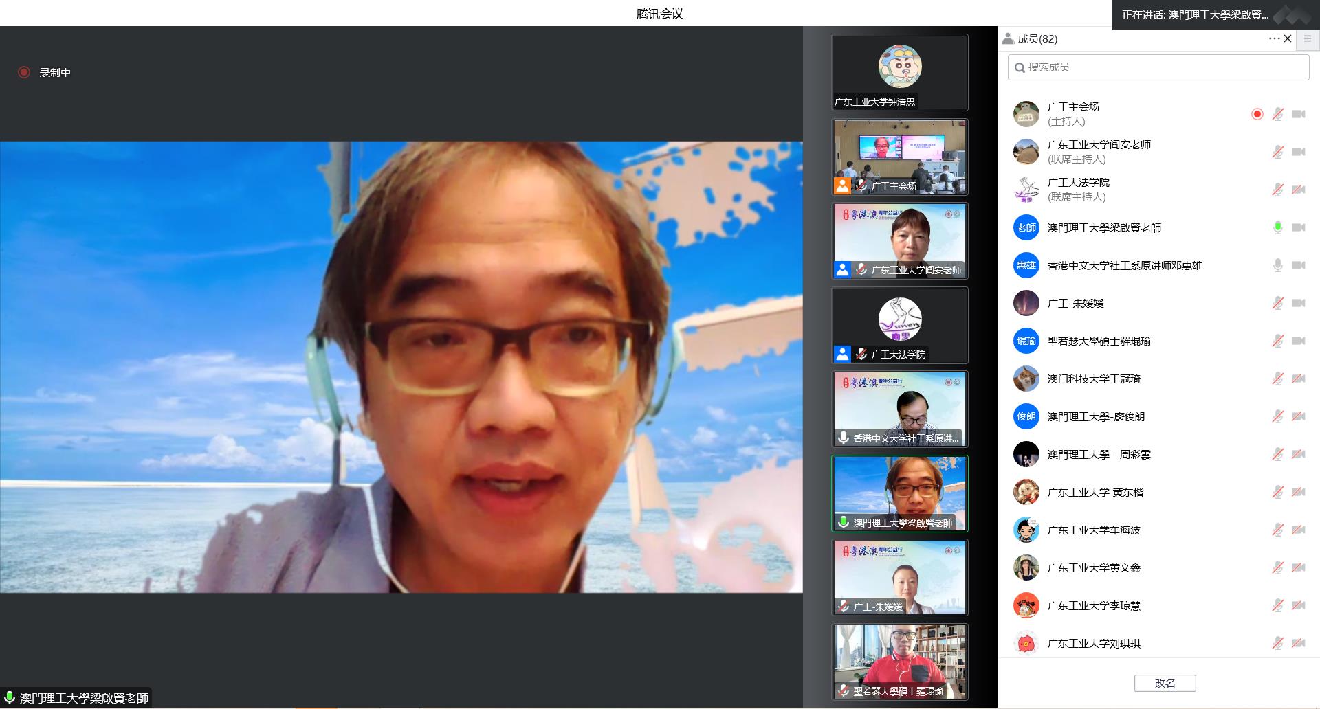在三地社会工作发展情况交流环节,香港中文大学社会工作学系原讲师邓惠雄从香港社会福利服务概况、香港社会工作者业界组织概况、新冠疫情下社会工作面临的挑战与机遇等三方面介绍了香港社会工作发展情况;澳门理工大学社会工作学系讲师梁启贤以《澳门社会工作:官民合作的典范》为题,阐述了澳门社会服务、澳门社会工作局和澳门非政府组织的运行情况;8xbet网法学院社会工作系副教授朱媛媛则介绍了该校社会工作专业课程设置及实习安排。