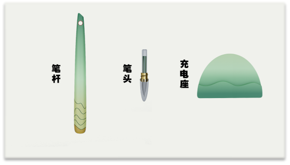 参赛作品技术说明:作品主要运用点阵数码识别技术,在智能毛笔的左右两侧装设高速摄像头,在笔内装有数码处理中心和电池等后端设备。笔头可以实现更换大小、颜色、重复使用。毛笔配备专属 APP 功能进行图文编辑、毛笔状态检测和论坛分享等功能。