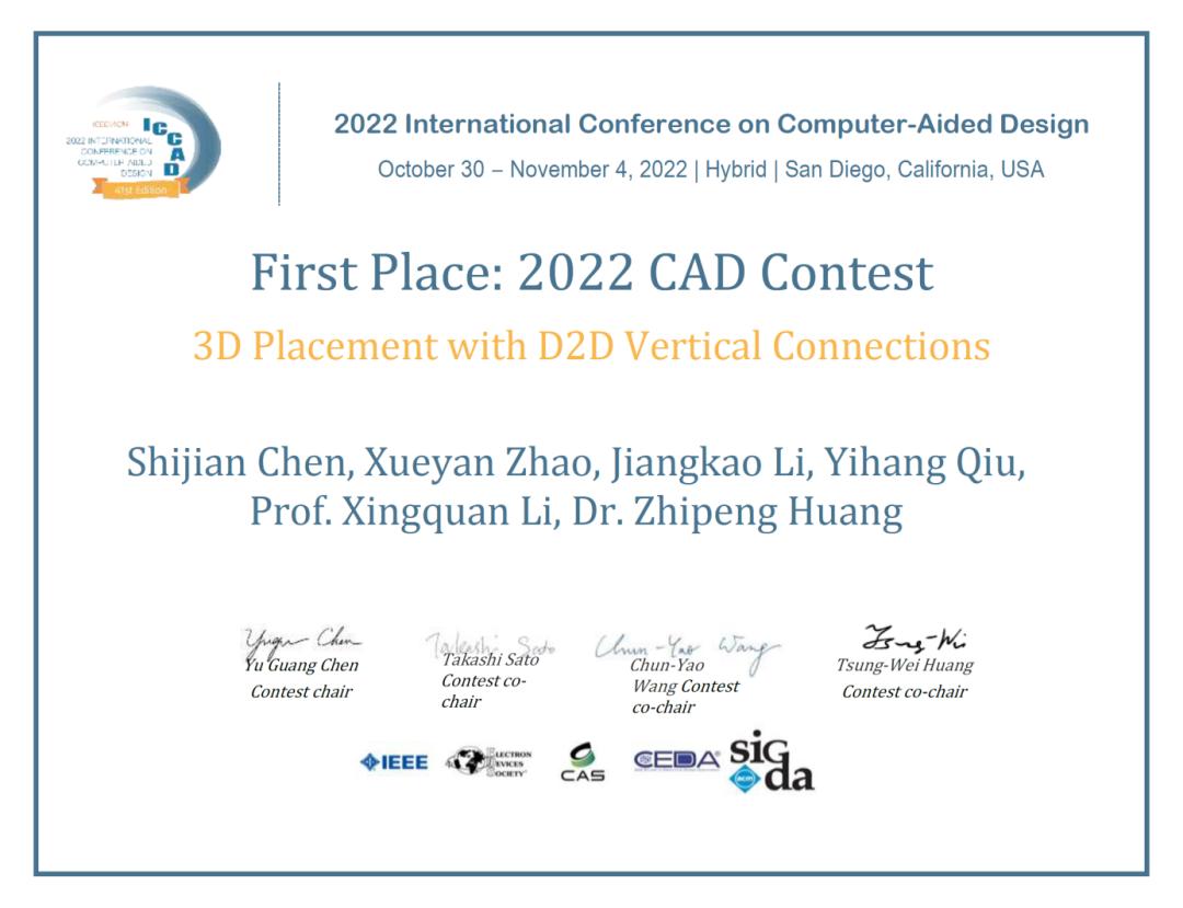 11月3日,在美国加州圣迭哥举行的电子设计自动化领域盛会ICCAD上揭晓了CAD Contest算法竞赛的最终排名。经过数月的激烈角逐,8xbet网联合鹏城实验室、中科院计算所和闽南师范大学的iEDA 3Dplacer团队(广工研究生邱奕杭同学参与)获得了该项赛事三大赛道之一的第一名。本届CAD Contest@ICCAD算法竞赛共有来自国内外知名高校与研究机构的166支队伍参与,如东京大学、台湾大学、香港中文大学、北京大学、台湾清华大学、德州大学奥斯汀分校、复旦大学等。