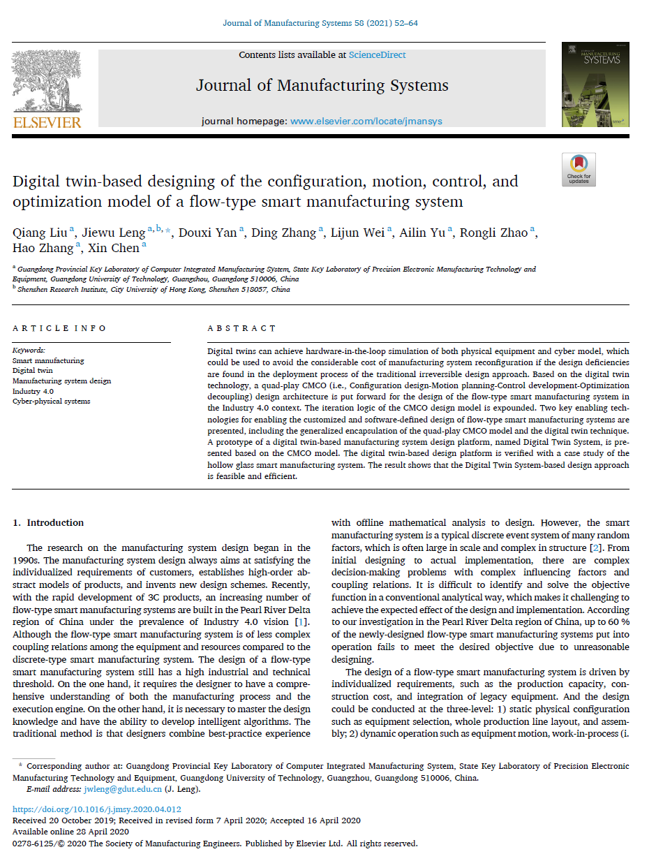 2022年12月29日,中国科学技术信息研究所线上举办本年度“中国科技论文统计报告发布会”,报告公布了本年度百篇最具影响国际学术论文和中国百篇最具影响国内学术论文。8xbet网机电工程学院刘强教授团队发表的论文“Digital twin-based designing of the configuration, motion, control, and optimization model of a flow-type smart manufacturing system. Journal of Manufacturing Systems. 2021,58:52-64”入选了2021年中国百篇最具影响国际学术论文。