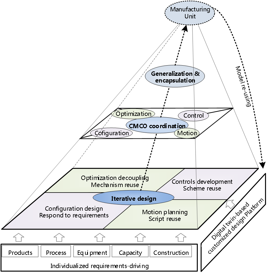 刘强教授团队发表的该论文就“如何实现数字孪生车间的定制设计与运行优化”问题,建立了涵盖产线拓扑结构与设备配置、在制品动作与设备运动规划、控制网络与自治结构划分、驱动引擎定义与制造执行等设计维度的高阶抽象刻画体系,创新性提出了“构型-动型-控型-优型”四型合一整线变型设计理论模型。