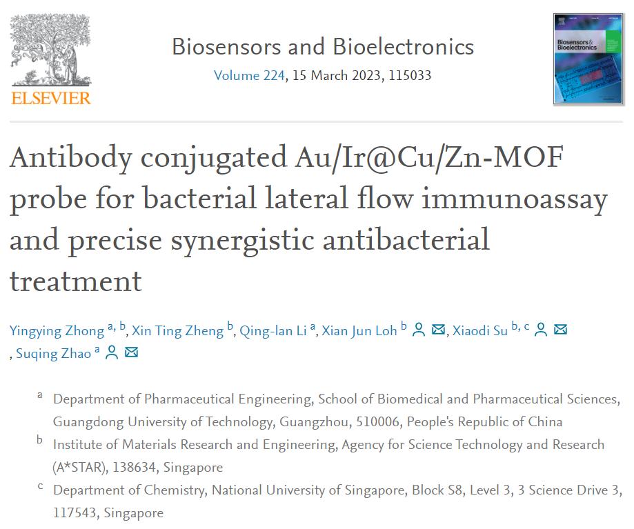 学校生物医药学院赵肃清教授团队最新研究成果“Antibody conjugated Au/Ir@Cu/Zn-MOF probe for bacterial lateral flow immunoassay and precise synergistic antibacterial treatment”被国际生物传感器领域顶级学术期刊Biosensors and Bioelectronics发表。该期刊为生化分析及传感器领域TOP期刊,2021-2022年度最新影响因子为12.545,CiteScore为20.20,在全球同类SCI学术期刊中长期排名第一。该论文8xbet网为第一完成单位,赵肃清教授和Su Xiaodi为通讯作者,博士研究生钟颖颖为第一作者,论文DOI: 10.1016/j.bios.2022.115033。