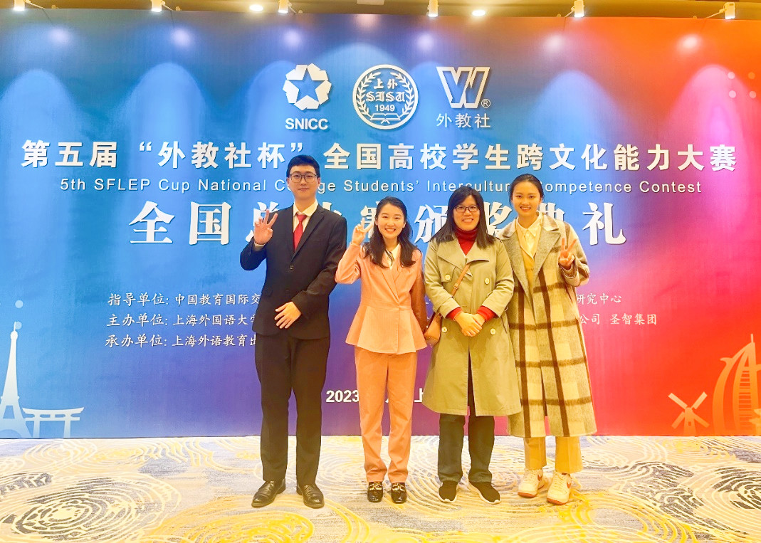 特别值得一提的是,我校代表队去年勇夺第四届“外教社杯”全国高校学生跨文化能力大赛全国总决赛亚军(一等奖),今年继续闯进全国总决赛并再夺全国一等奖。优异成绩的背后是外国语学院领导的高度重视、指导老师的辛勤付出和参赛学生的刻苦备赛。今后,外国语学院将持续贯彻“以赛促学、以赛促教、学赛结合”的教育理念,继续探索学科竞赛新思路,充分挖掘竞赛育人作用,为培养高质量融合型外语人才贡献力量。