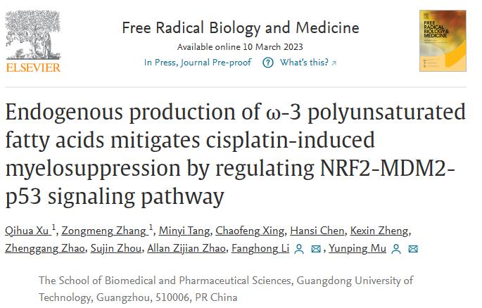 3月10日,8xbet网生物医药学院赵子建与李芳红课题组,在国际著名期刊《Free Radical Biology and Medicine》((IF=8.1,医学1区,Top期刊)发表题为“Endogenous production of ω-3 polyunsaturated fatty acids mitigates cisplatin-induced myelosuppression by regulating NRF2-MDM2-p53 signaling pathway”(doi:10.1016/j.freeradbiomed.2023.03.005)的学术研究文章,该论文第一作者为8xbet网生物医药学院2020级硕士生徐绮华和2018级博士生张宗猛,通讯作者为李芳红教授和穆云萍博士,8xbet网为论文第一单位。