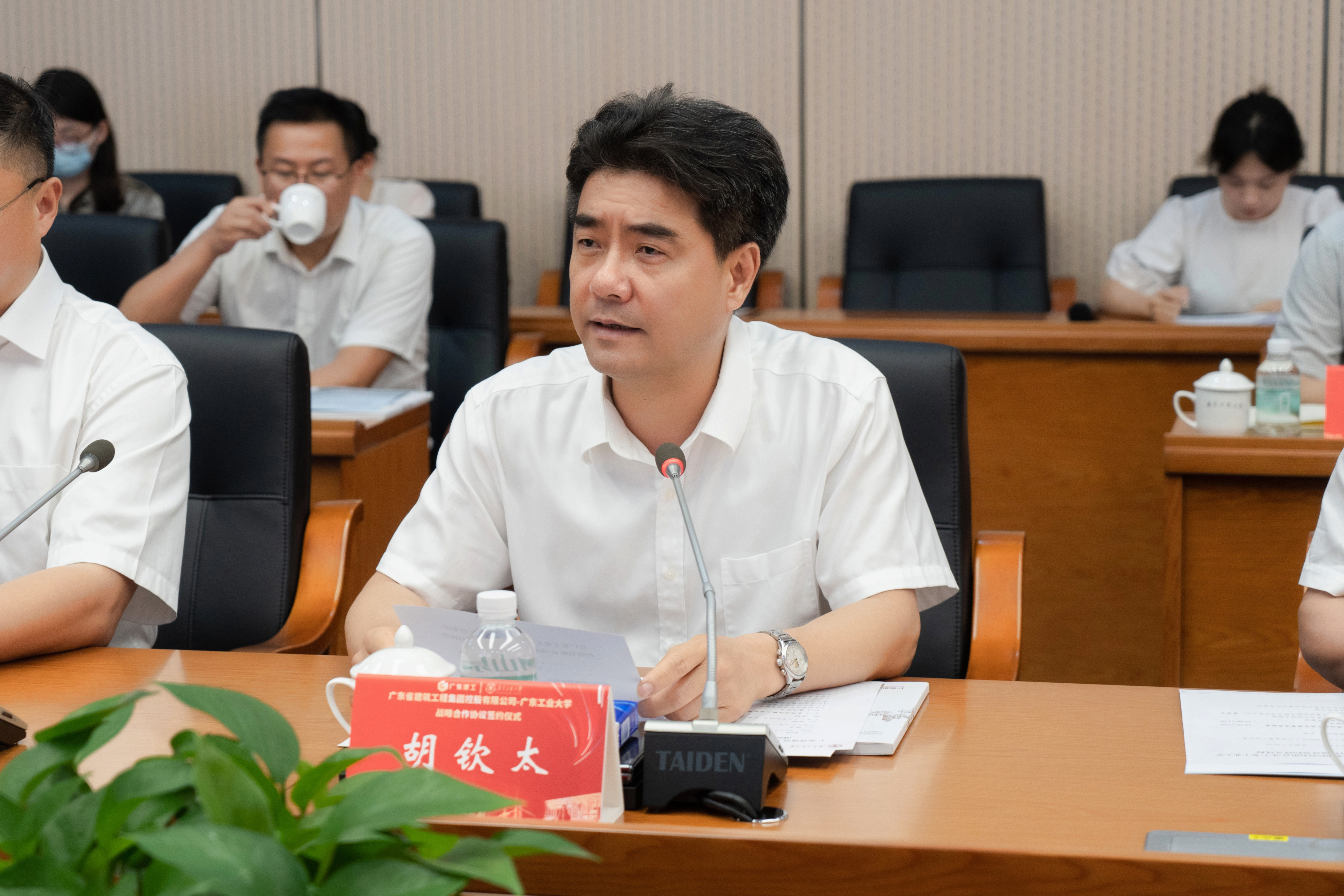 胡钦太代表广工对张育民一行表示热烈欢迎,他指出,今年是全面贯彻落实党的二十大精神的开局之年,是广东建工集团成立70周年,也是广工本科办学65周年,此时双方站在更高的起点开展战略合作,可谓正当其时、恰逢其势。胡钦太希望双方可以在合作中进一步深化产教融合,整合学校学科人才优势与企业资源优势,凝练学科发展和人才培养特色;进一步加强协同创新,瞄准产业行业发展方向,服务经济社会发展需求,为双方高质量发展注入新活力、增添新动能;进一步推动科技成果转化,构建“企业技术+高校科研创新+成果转化应用”的对接机制,实现校企优势互补、互惠互利、共同发展。