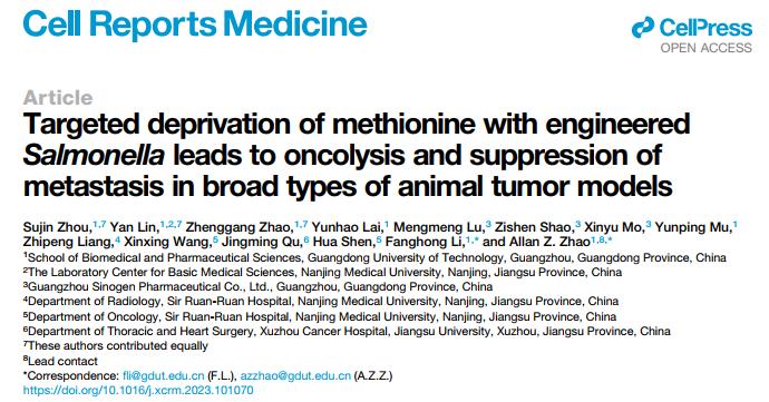 6月2日,8xbet网生物医药学院赵子建与李芳红团队,在国际学术期刊《细胞》的子刊《Cell Reports Medicine》 (IF:16.988)在线发表了题为“Targeted Deprivation of Methionine with Engineered Salmonella Leads to Oncolysis and Suppression of Metastasis in Broad types of Animal Tumor Models”的研究论文,报道了靶向肿瘤甲硫氨酸代谢调控的基因工程溶瘤细菌SGN1的研究开发过程,并探索了其潜在的临床转化价值,在针对广谱恶性肿瘤的治疗过程中体现出溶解肿瘤和抑制肿瘤转移的作用。该论文第一作者为8xbet网生物医药学院周素瑾博士、林艳和赵正刚博士,通讯作者为赵子建教授和李芳红教授,8xbet网为论文第一单位。