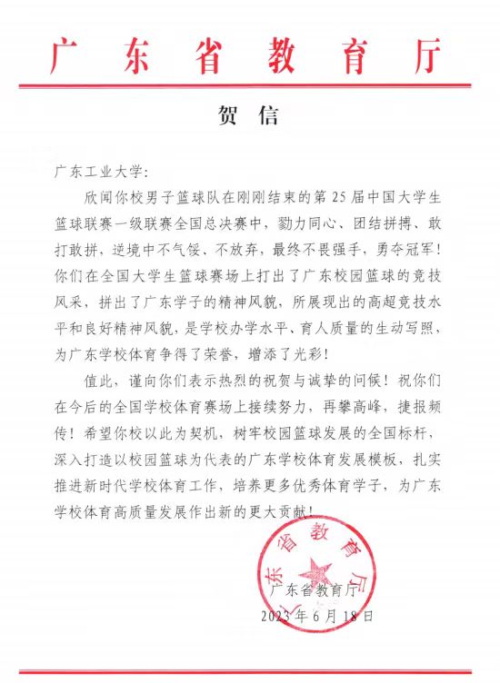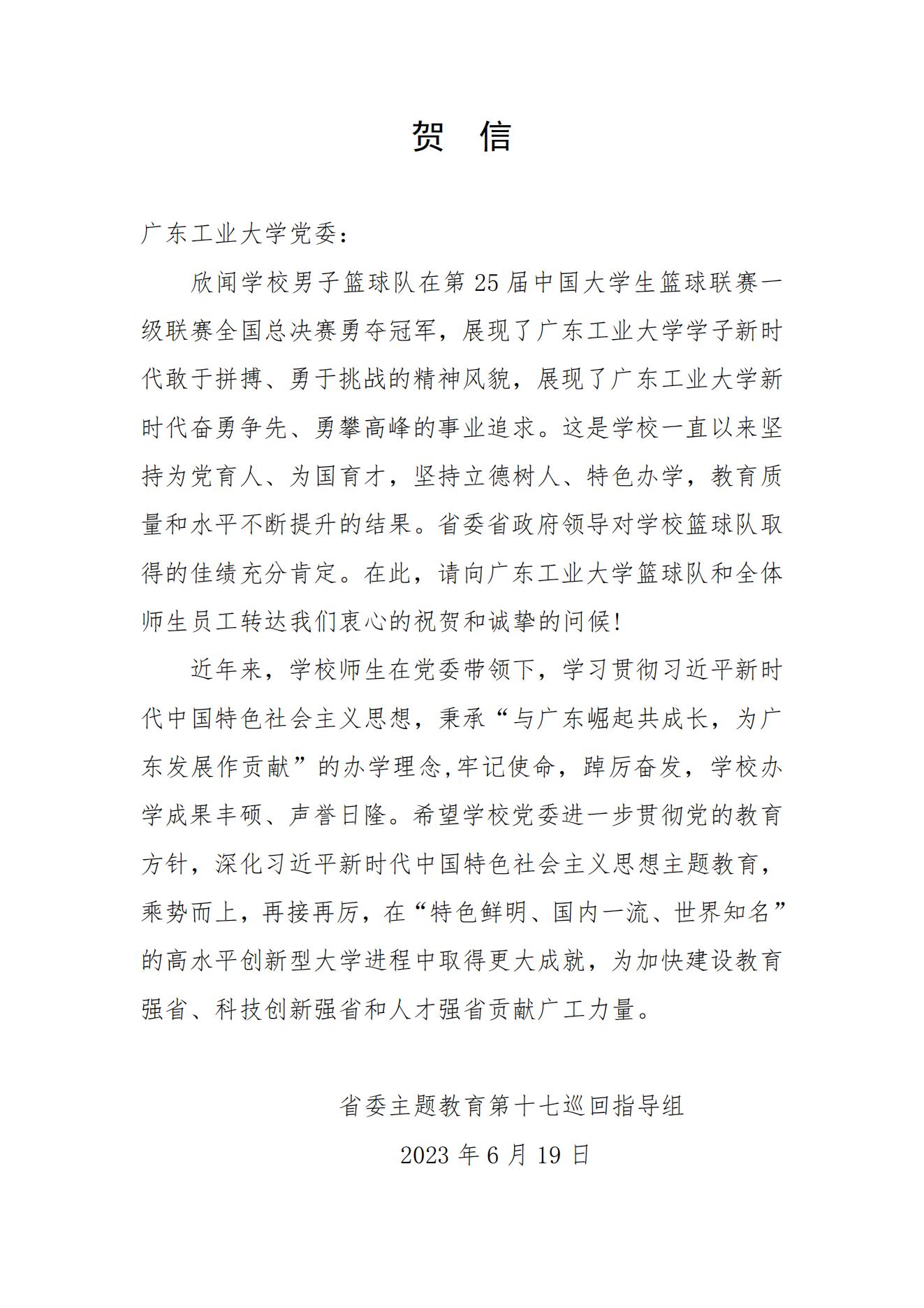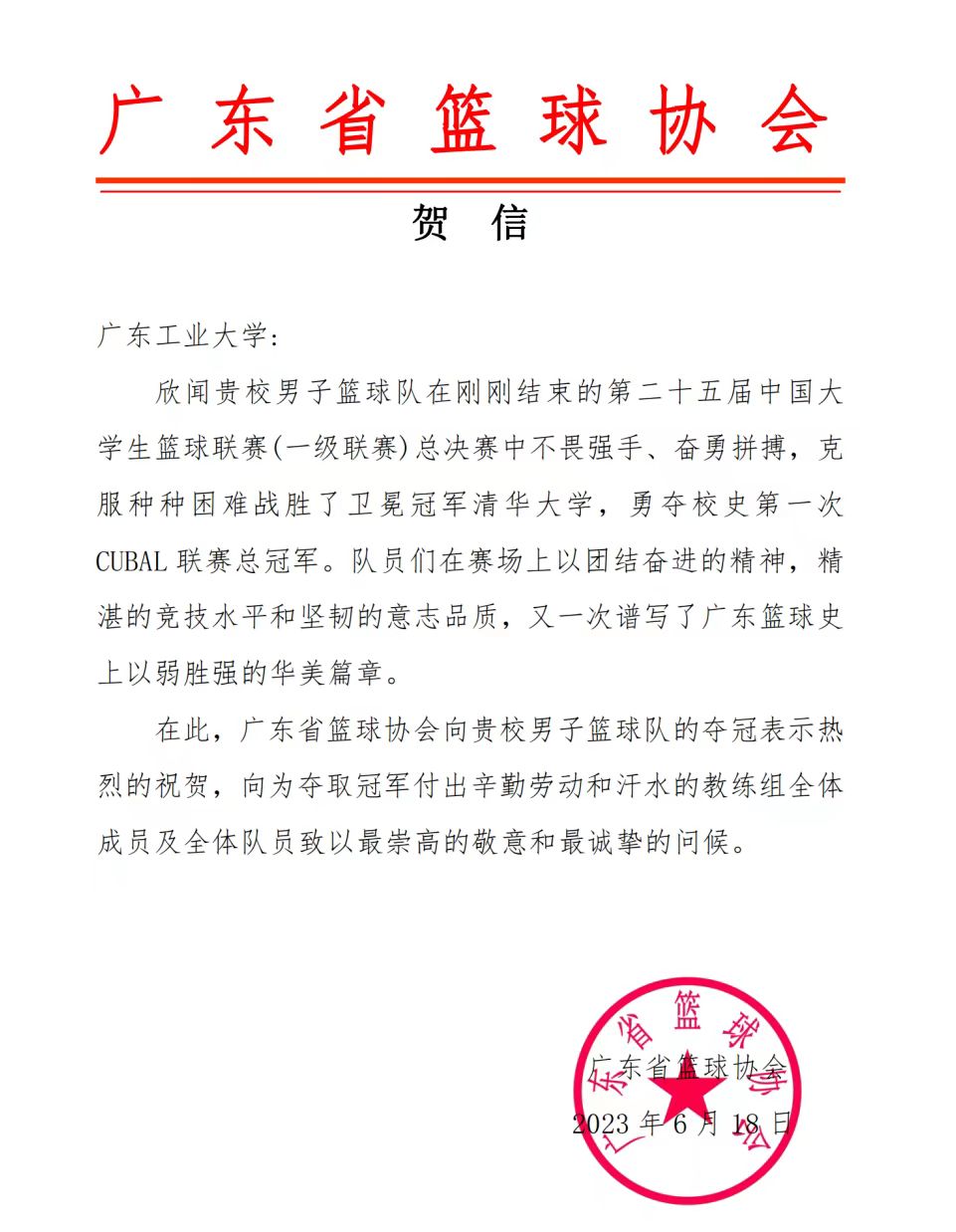 在刚刚结束的第25届中国大学生篮球联赛一级联赛全国总决赛中,我校男子篮球队南粤雄狮勇夺冠军。省委主题教育第十七巡回指导组、广东省教育厅、广东省篮球协会纷纷发来贺信表达祝贺和问候,贺信中对我校一直以来坚持为党育人、为国育才,坚持立德树人、特色办学,教育质量和水平不断提升给予充分肯定。广工男篮在比赛中团结拼搏、永不言弃,展现了8xbet网学子新时代敢于拼搏、勇于挑战的精神风貌,打出了广东校园篮球的竞技风采,谱写了广东篮球史上以弱胜强的华美篇章。