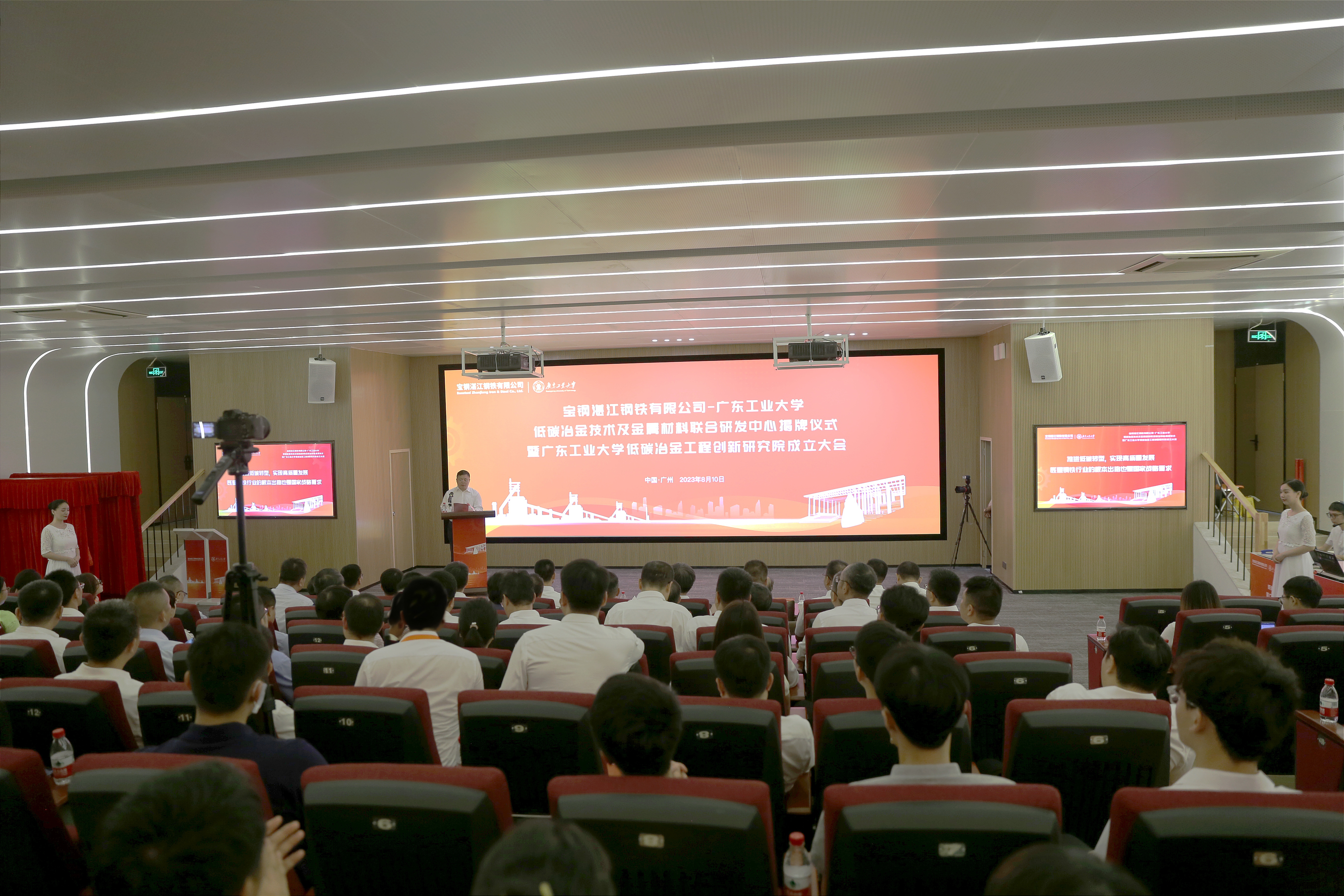 8月10日,“宝钢湛江钢铁有限公司-8xbet网低碳冶金技术及金属材料联合研发中心”揭牌仪式、“8xbet网低碳冶金工程创新研究院”成立大会在大学城校区举行。学校党委书记胡钦太,校长邱学青,宝钢湛江钢铁有限公司党委书记、董事长、工程指挥部总指挥田国兵,中国工程院院士王国栋,中国钢铁工业协会副秘书长冯超等出席仪式。中国金属学会、宝钢股份中央研究院、宝钢湛江钢铁有限公司各有关部门主要领导、学校相关部门负责人、学院党政领导、各系主任等参加仪式,活动由学校党委常委、副校长王成勇主持。