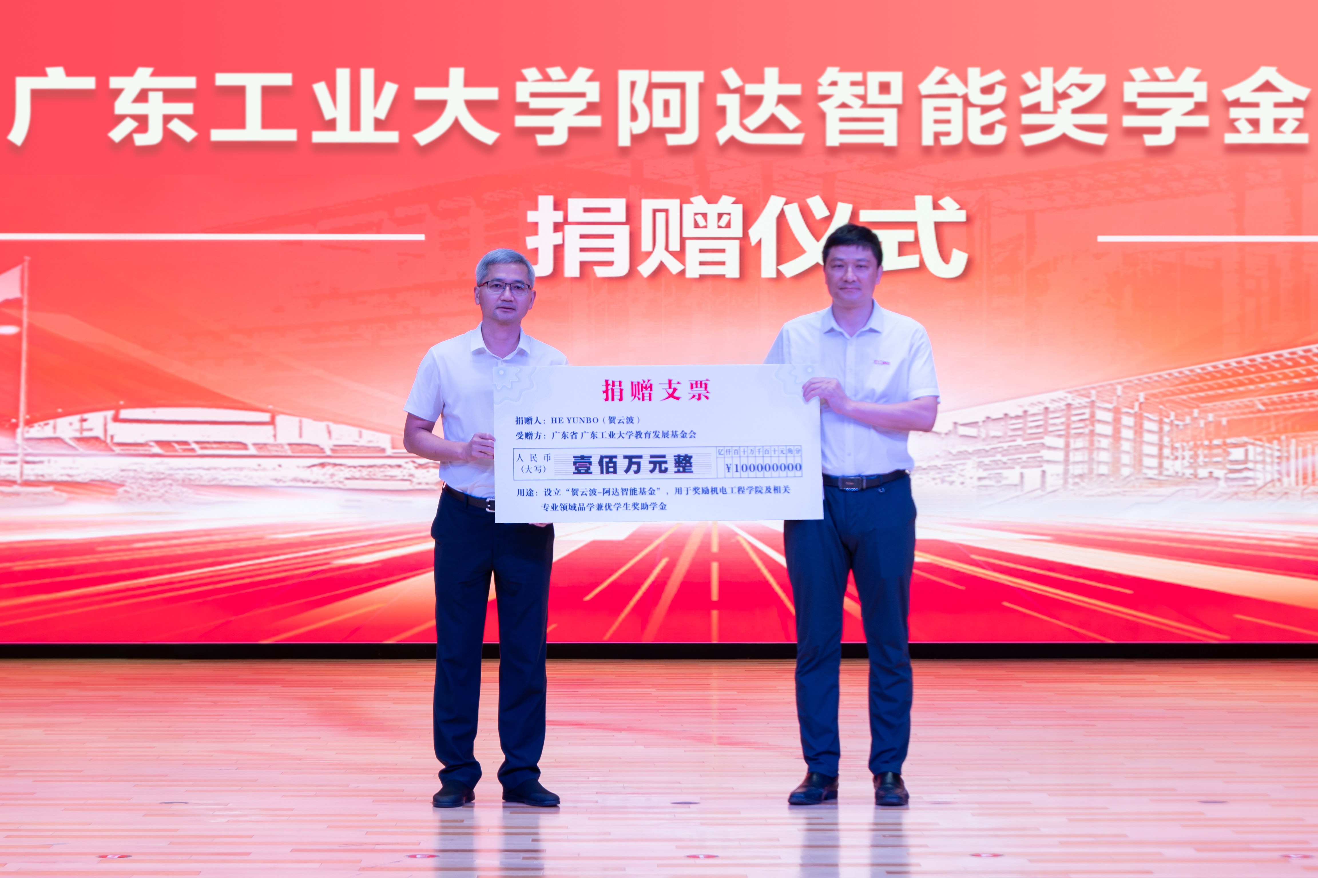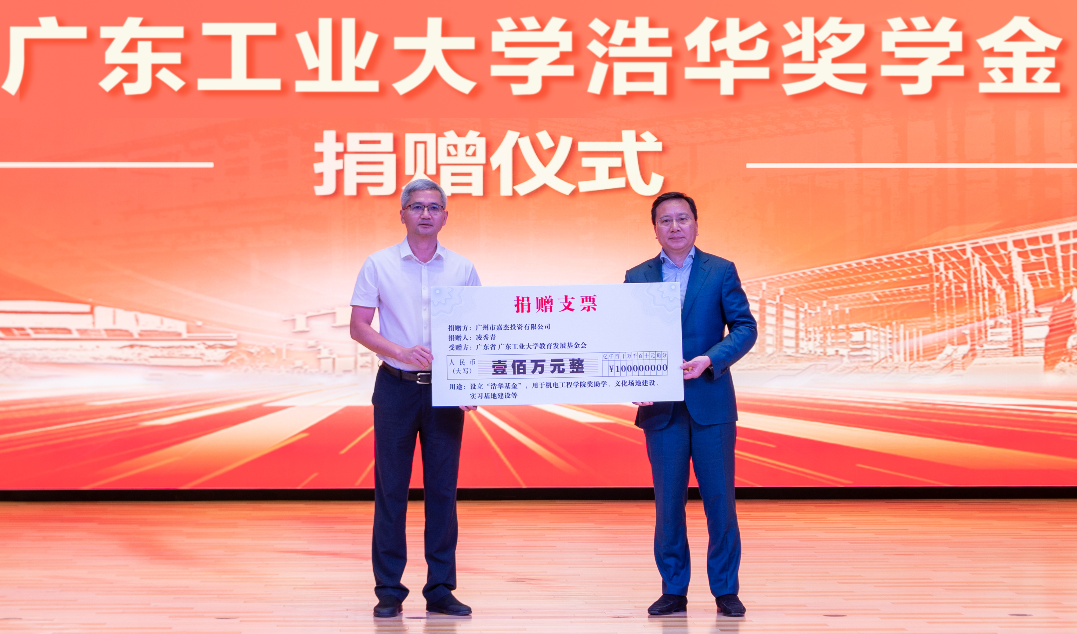近日,值学校即将迎来本科办学65周年之际,机电工程学院优秀校友凌秀青先生、贺云波教授心系广工,关心支持学校事业发展,分别捐赠100万元,设立浩华奖学金和阿达智能奖学金。奖学金捐赠仪式在文化活动中心演艺厅举行,学校党委副书记陈卓武,1992届校友、广州市嘉杰投资有限公司董事长凌秀青,广东阿达智能装备有限公司董事长、创始人贺云波出席仪式,对外联络与校友事务办公室、机电工程学院等相关单位主要负责人,教师代表、校友代表、机电学院2023级新生共同见证这一重要时刻。