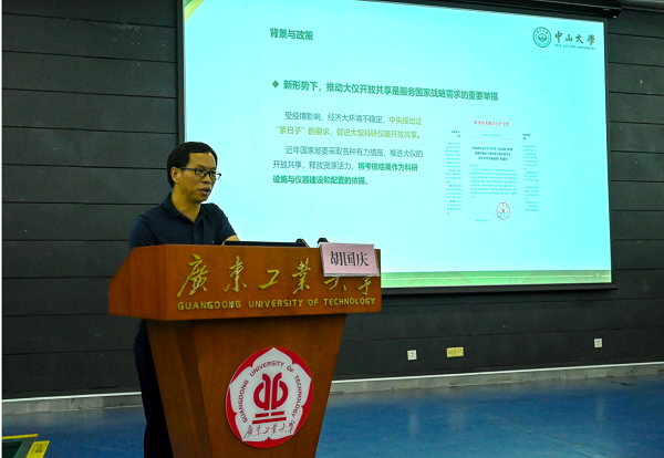 中山大学设备与实验室管理处处长胡国庆教授以《大型仪器共享管理的探索与实践》为主题介绍了大型仪器开放共享的背景与政策,与大家一起探讨了推动大仪开放共享工作中所遇到的问题与困境,分享了中大在大仪开放共享管理工作方面所做出的探索与实践。