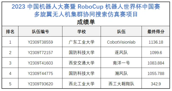 近日,2023中国机器人大赛暨RoboCup机器人世界杯中国赛(大赛入选《全国普通高校学科竞赛排行榜》)落下帷幕,广工学生创新创业团队——CobotVisionLab团队(共融机器人视觉团队)在多旋翼无人机集群协同搜索仿真赛项中与国防科技大学、西安交通大学、西北工业大学等高校团队同台竞技,以1136.18分的比赛成绩蝉联冠军,荣获全国一等奖。CobotVisionLab团队在近三年比赛中创造了RoboCup中国赛两次冠军,一次亚军的佳绩!