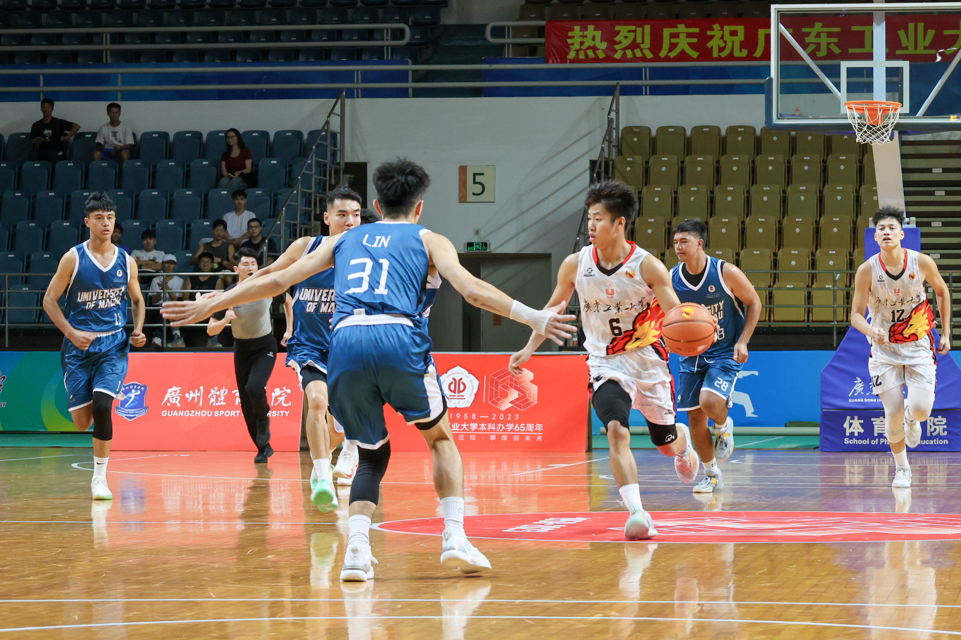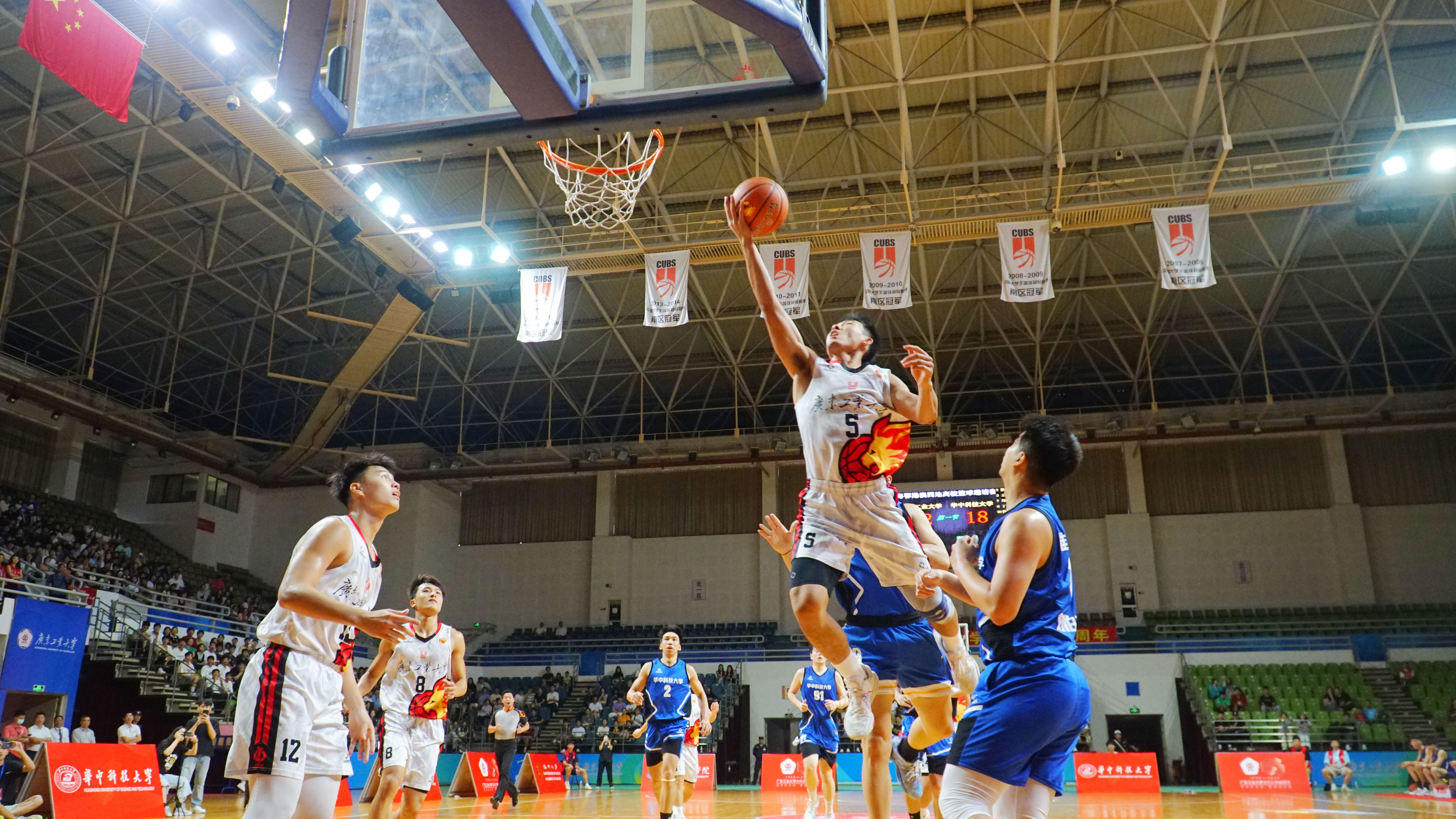 决赛中,广工、华中大双方队员激烈拼抢,华中大率先突破得分,广工予以回应,双方交替领先,比分焦灼。次节,广工投入多个三分球,将比分拉开,以50:37结束半场。易边再战,广工越战越勇,凭借积极传导、精妙配合和三分的高命中率,进一步扩大领先优势,最终以103:65取胜,获得比赛冠军。