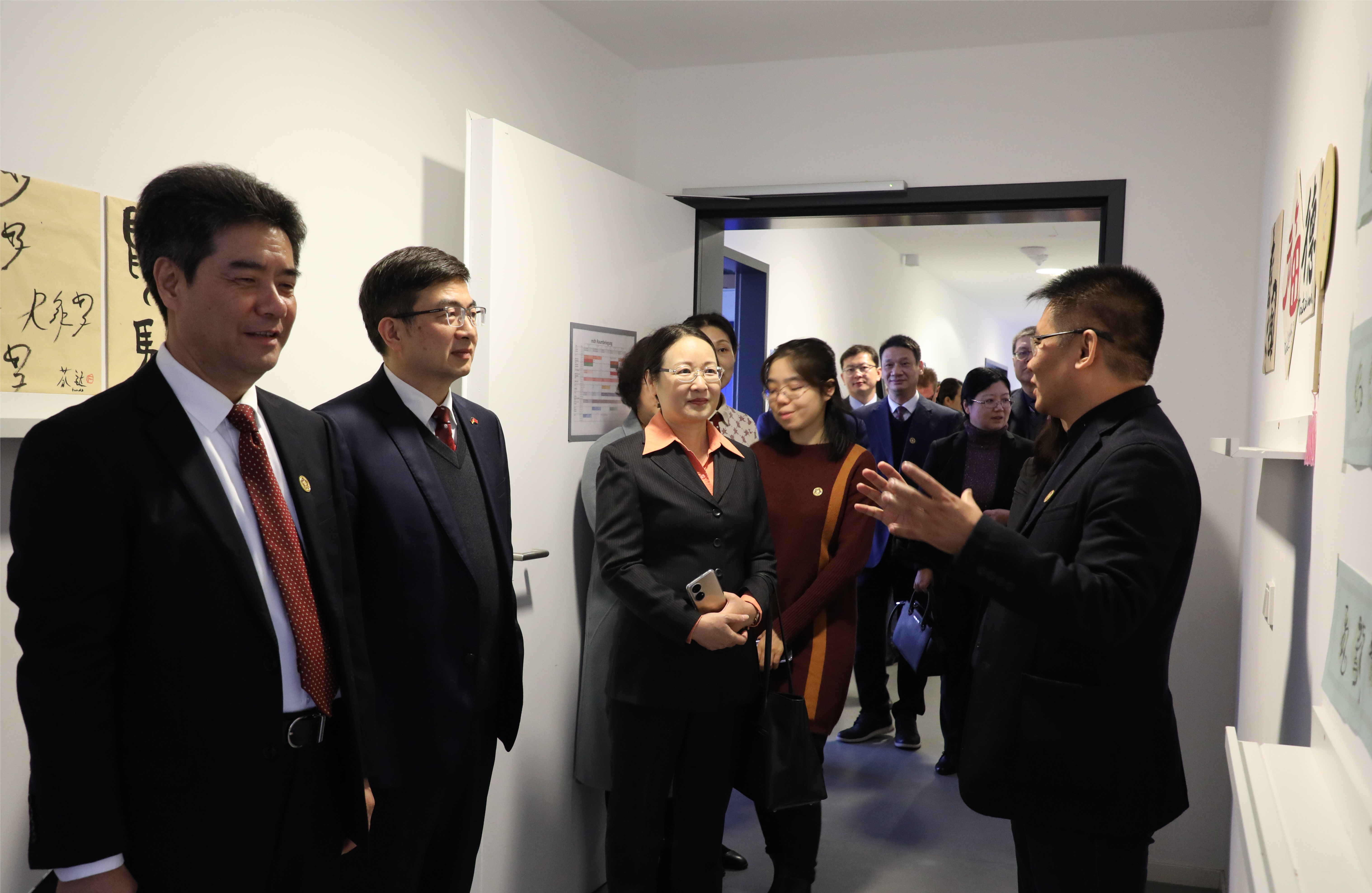 在代表团正式访问德国前,学校与柏林媒体设计学院就人才培养、课程对接、师资培训等通过视频会议等形式进行了多轮会晤与磋商,前期合作基础扎实。2023年10月,我校艺术与设计学院在柏林媒体设计学院开设教师工作坊,开启了两校文化合作的序幕。工作坊的课程吸引了柏林媒体设计学院师生的广泛关注,不少德国当地学生参加了这一课程,体验了中国传统书法的笔墨挥毫,感受到了中国独特的传统美学。此次访问,黄伟参赞陪同胡钦太书记到工作坊参观学生作品展并检视教学成果。未来,学校将从工作坊经验中探索多种模式的交流合作,为教育合作的互学互鉴和资源共享搭建平台、创造条件。