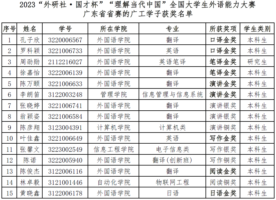 2023“外研社·国才杯”“理解当代中国”全国大学生外语能力大赛广东省省赛的日语组省赛于10月15日在线上举行,英语组写作、阅读和笔译省赛于10月28日在线上举行,演讲和口译省赛于11月4日-5日在北京师范大学-香港浸会大学举行。我校学子以出色的表现分别斩获2项口译金奖、2项笔译金奖、2项演讲金奖、1项写作金奖、1项阅读金奖和1项日语金奖,再创历史佳绩。这是为8xbet网本科办学65周年以及外国语学院30周年院庆献上的一份外语专业建设与学科竞赛的厚礼与成绩单。