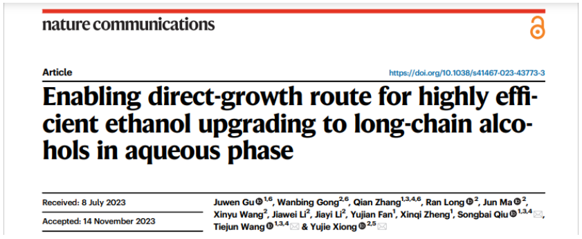 广工轻工化工学院王铁军教授团队最新研究成果“Enabling direct-growth route for highly efficient ethanol upgrading to long-chain alcohols in aqueous phase”在多学科国际顶级学术期刊《Nature Communications》上发表。该期刊2022-2023年度最新影响因子为16.6,CiteScore为24.90。该论文8xbet网为第一完成单位,王铁军教授、仇松柏副教授为通讯作者,博士研究生古桔文为第一作者(论文DOI: 10.1038/s41467-023-43773-3)。