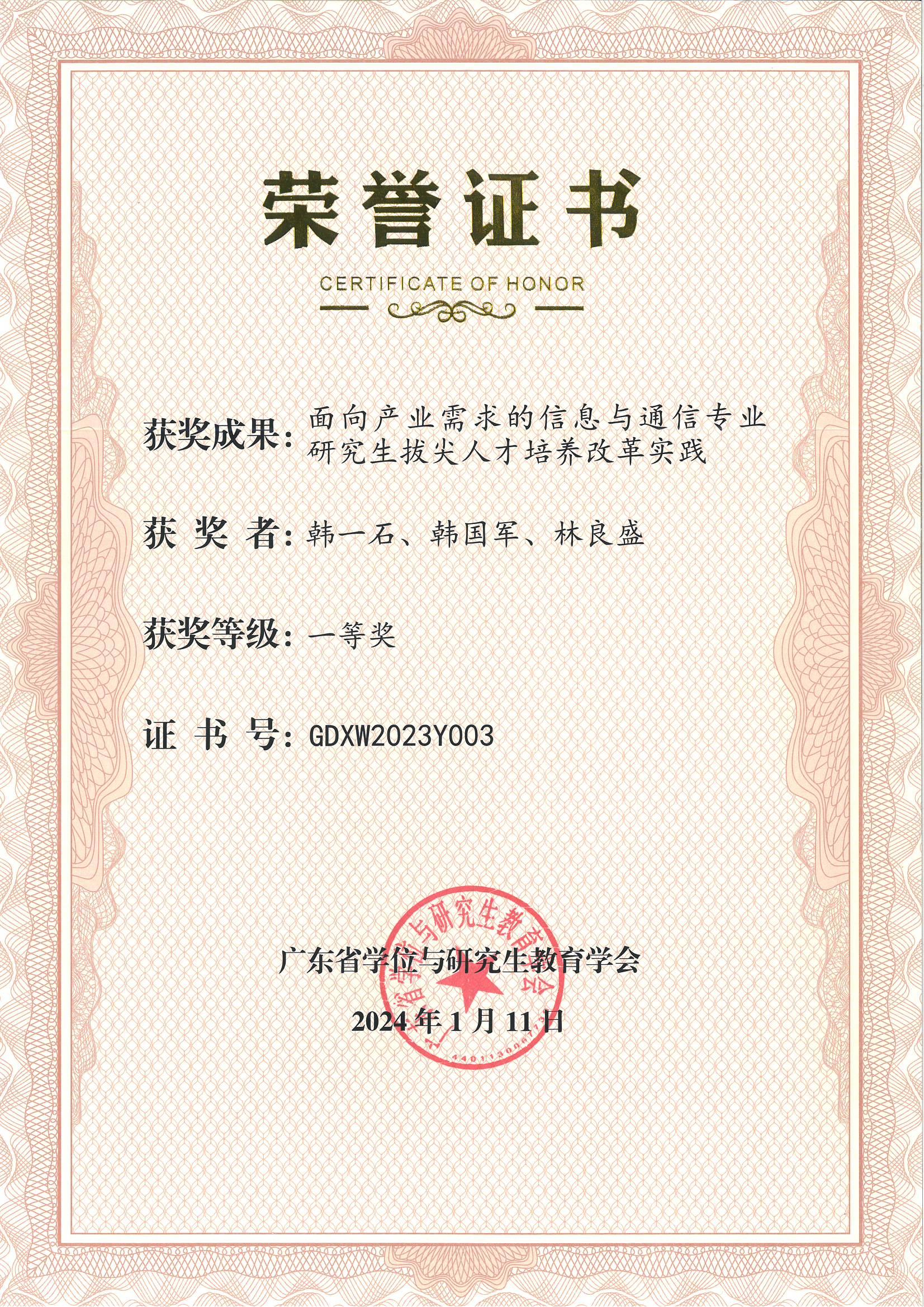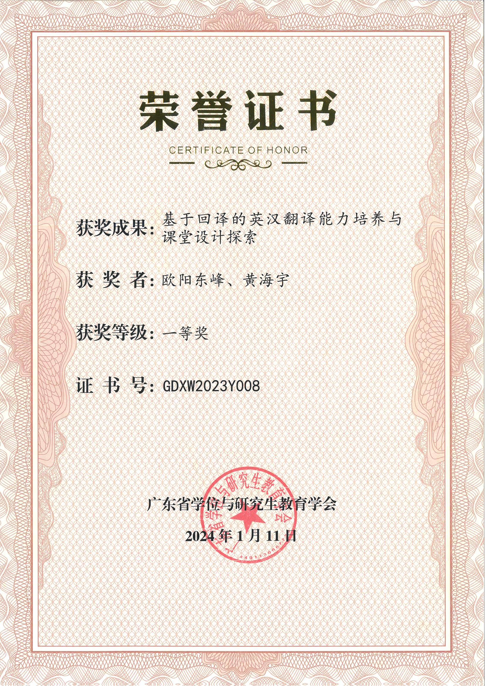 1月12日,广东省学位与研究生教育学会2023年学术年会在茂名召开,会上宣布了2023年优秀教学成果奖荣誉名单。我校推荐参评的两项成果——信息工程学院韩一石老师牵头完成的《面向产业需求的信息与通信专业研究生拔尖人才培养改革实践》、外国语学院欧阳东峰老师牵头完成的《基于回译的英汉翻译能力培养与课堂设计探索》均荣获一等奖。