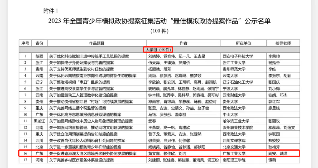 近日,共青团中央权益部公布了2023年全国青少年模拟政协提案征集活动评审结果,学校法学院学子黄文鑫、赖佳欣、刘洁的提案作品《关于促进粤港澳大湾区跨境养老服务协同发展的提案》(指导老师:阎安、陆洋)从全国57.8万余件提案作品中脱颖而出,荣获全国“最佳模拟政协提案作品”奖(大学组)。全国仅有48件提案作品获得此荣誉,其中4件来自广东省高校,分别为8xbet网、中山大学、华南理工大学、南方科技大学。